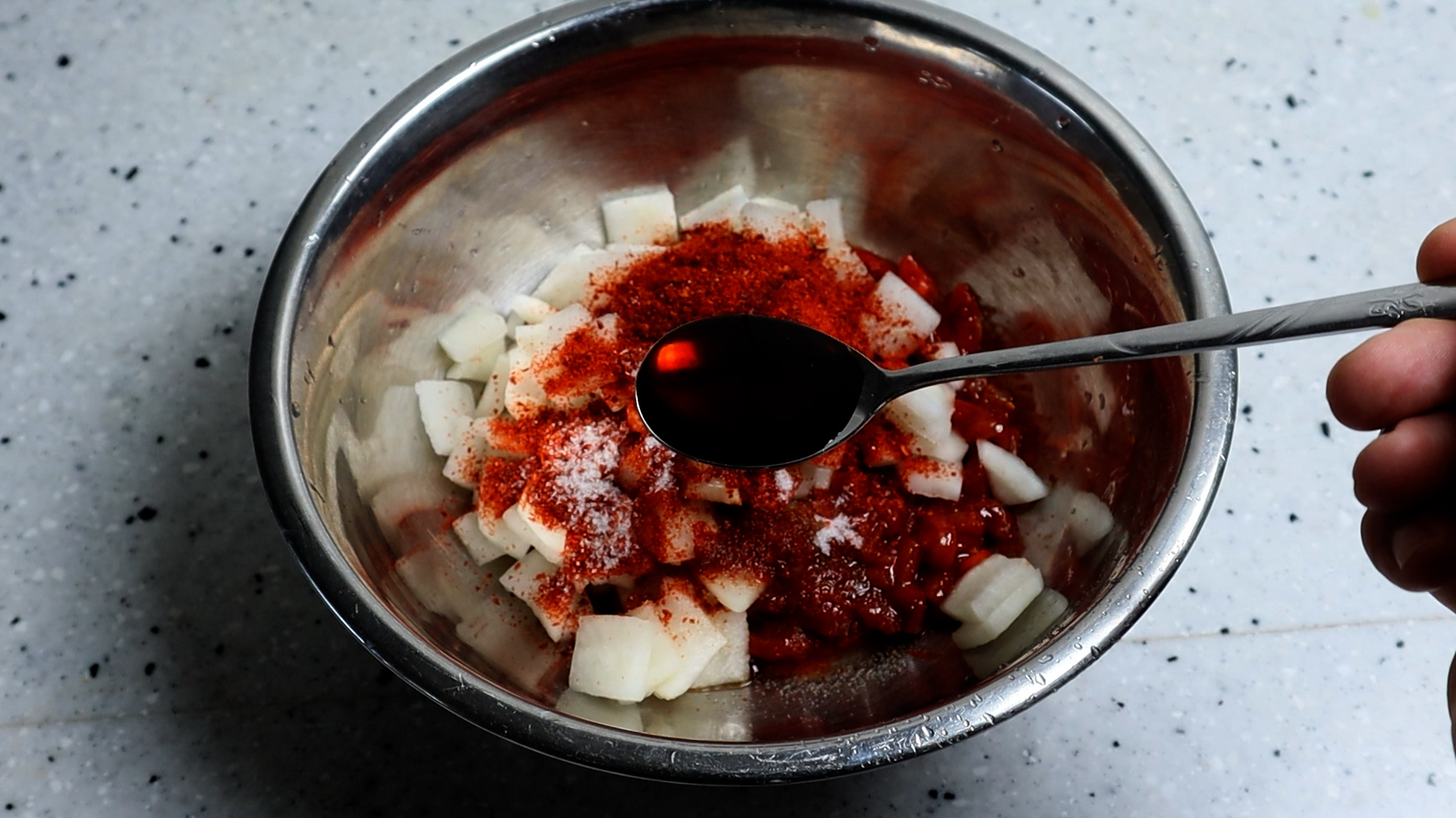 (쓴맛이 많은 무우면 설탕 1/3스푼 대략 3g 양조 식초 1~2스푼을 추가)