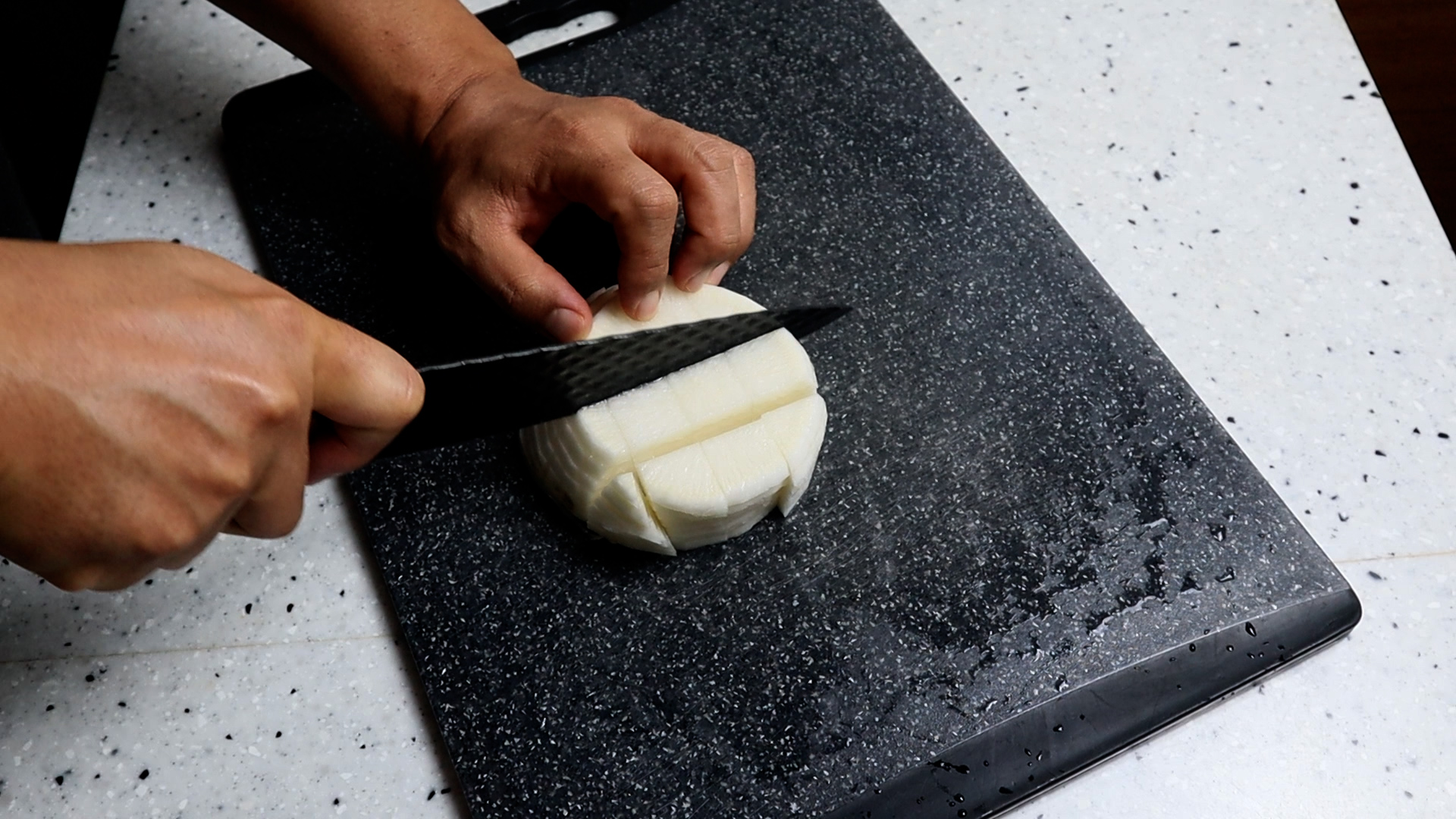 1. 무우 300g 을 3~4mm 두께로 썰어주세요. 저울이 없으면 3~4mm 두께로 대략 11조각 정도 잘라주세요.