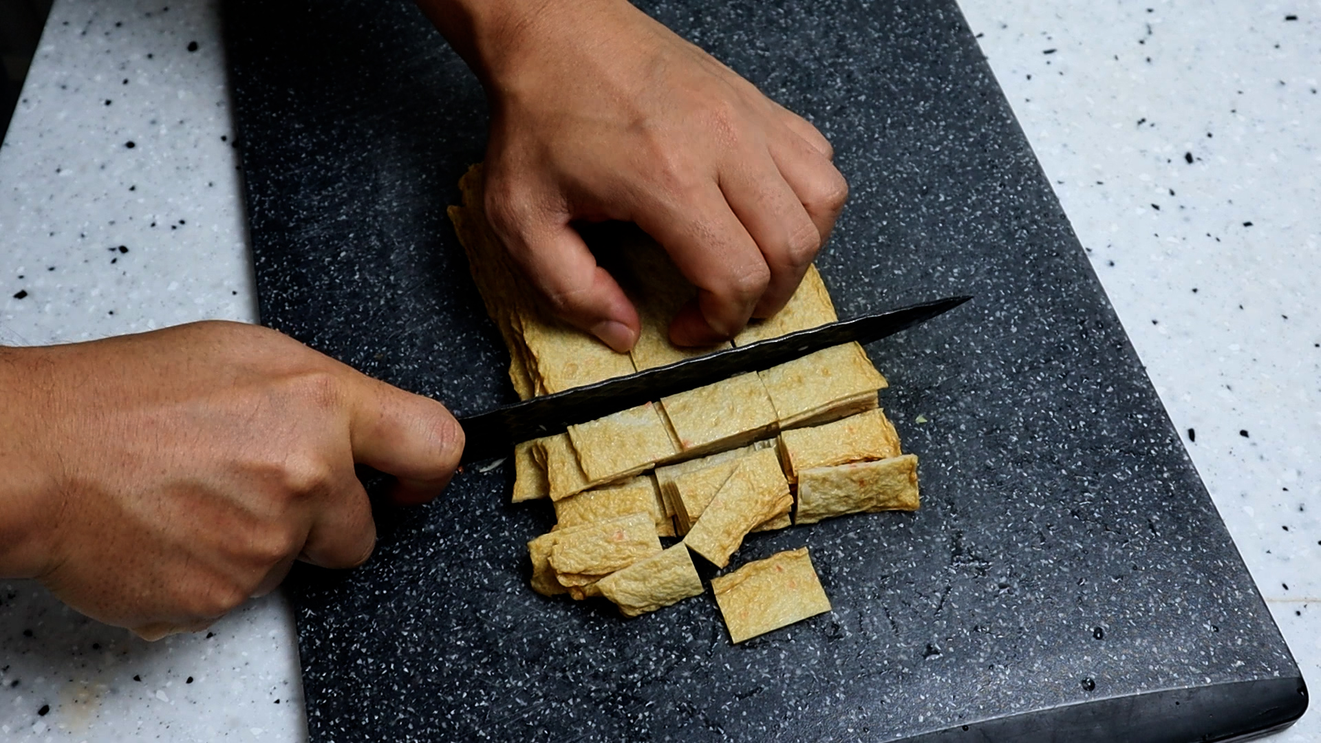 3. 사각어묵은 기호에 맞게 썰어주세요. 사각어묵은 1장당 업체마다 무게가 다 다르니 표기된 총무게에서 장수를 나누셔서 비슷하게 준비해주세요.