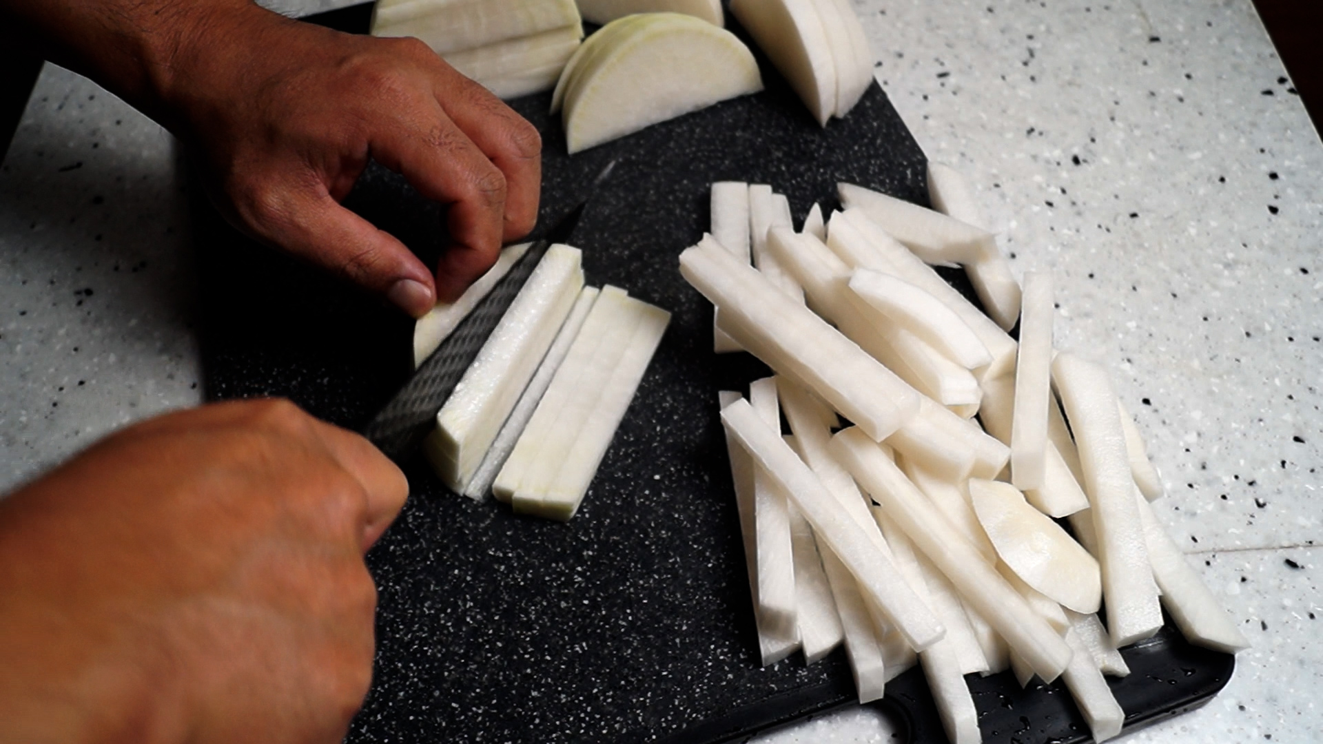 1. 무우를 1~1.5cm 두께로 좀 굵게 썰어주세요.