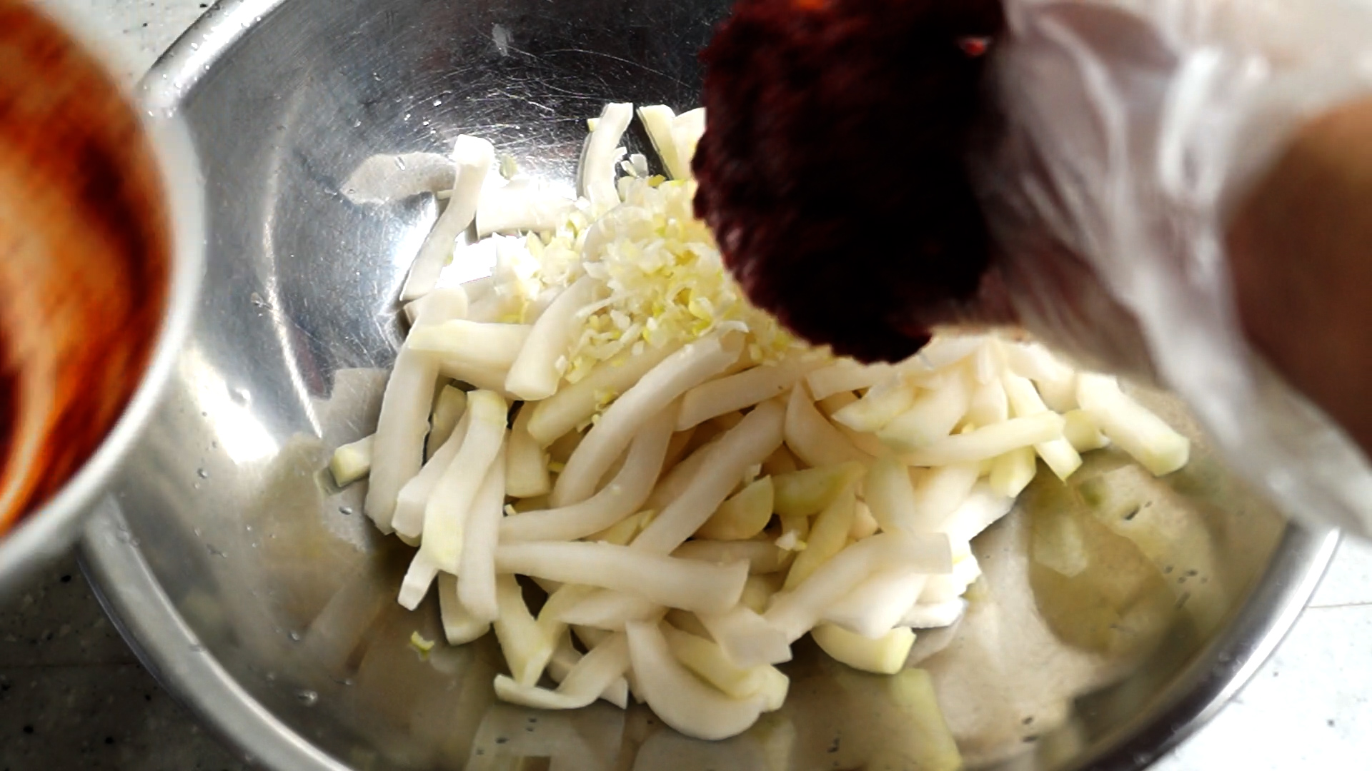 10. 절인무우를 너른 볼에 넣고 대파 넣고 양념장을 전부 부어주세요.