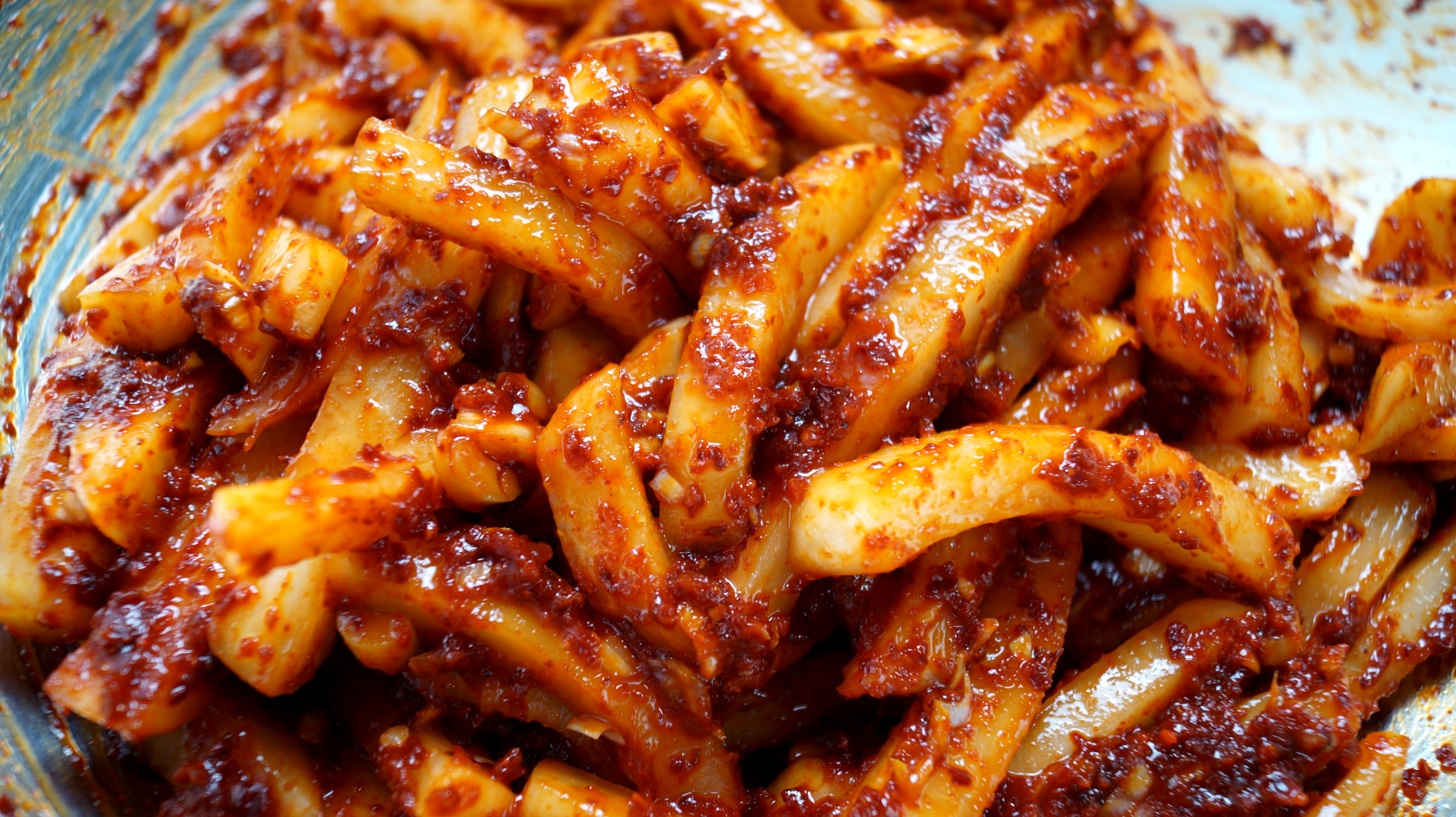 4. 양념장을 전부넣고 섞어주세요. 알싸한 매운맛이 강한 조합이니 일반맛 원하시면 생강가루를 절반으로 줄이세요.