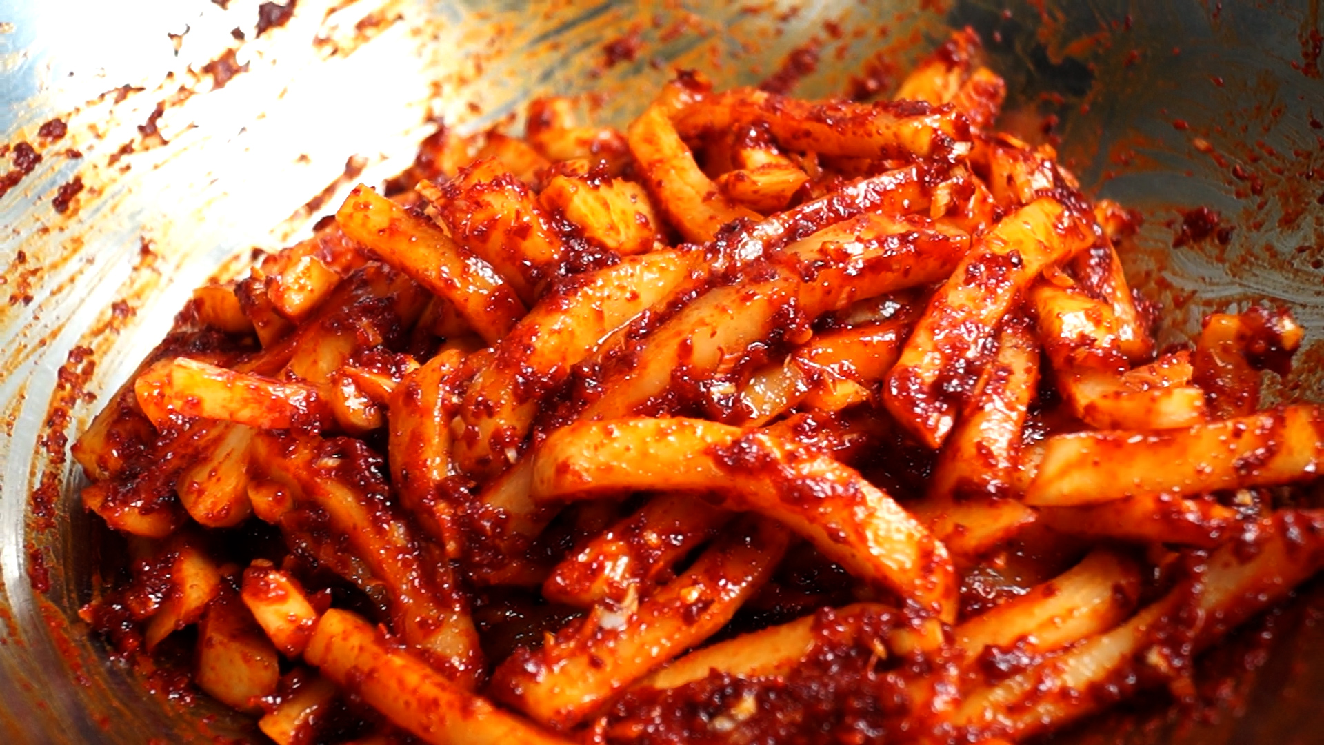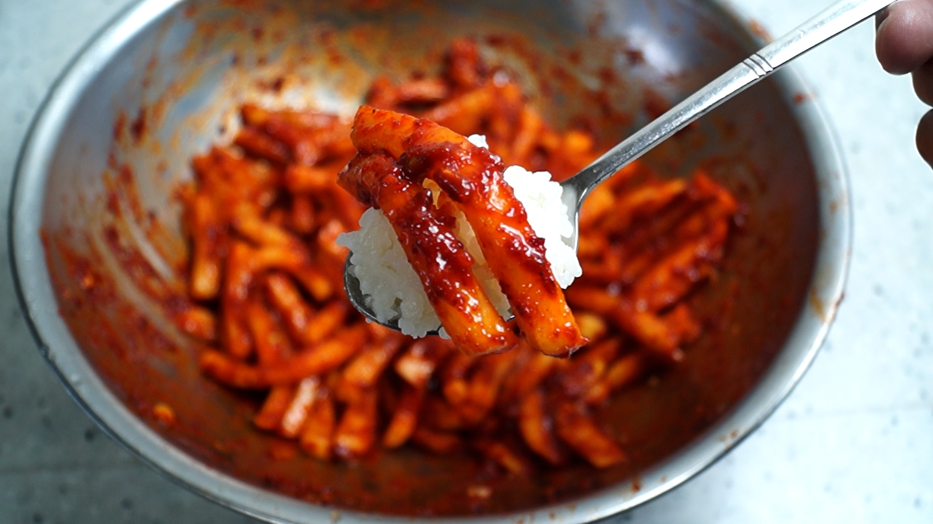 11. 적당히 힘을 줘가면서 버무려서 먹어보고 단맛이 모자라면 물엿을 조금 더 넣으세요.