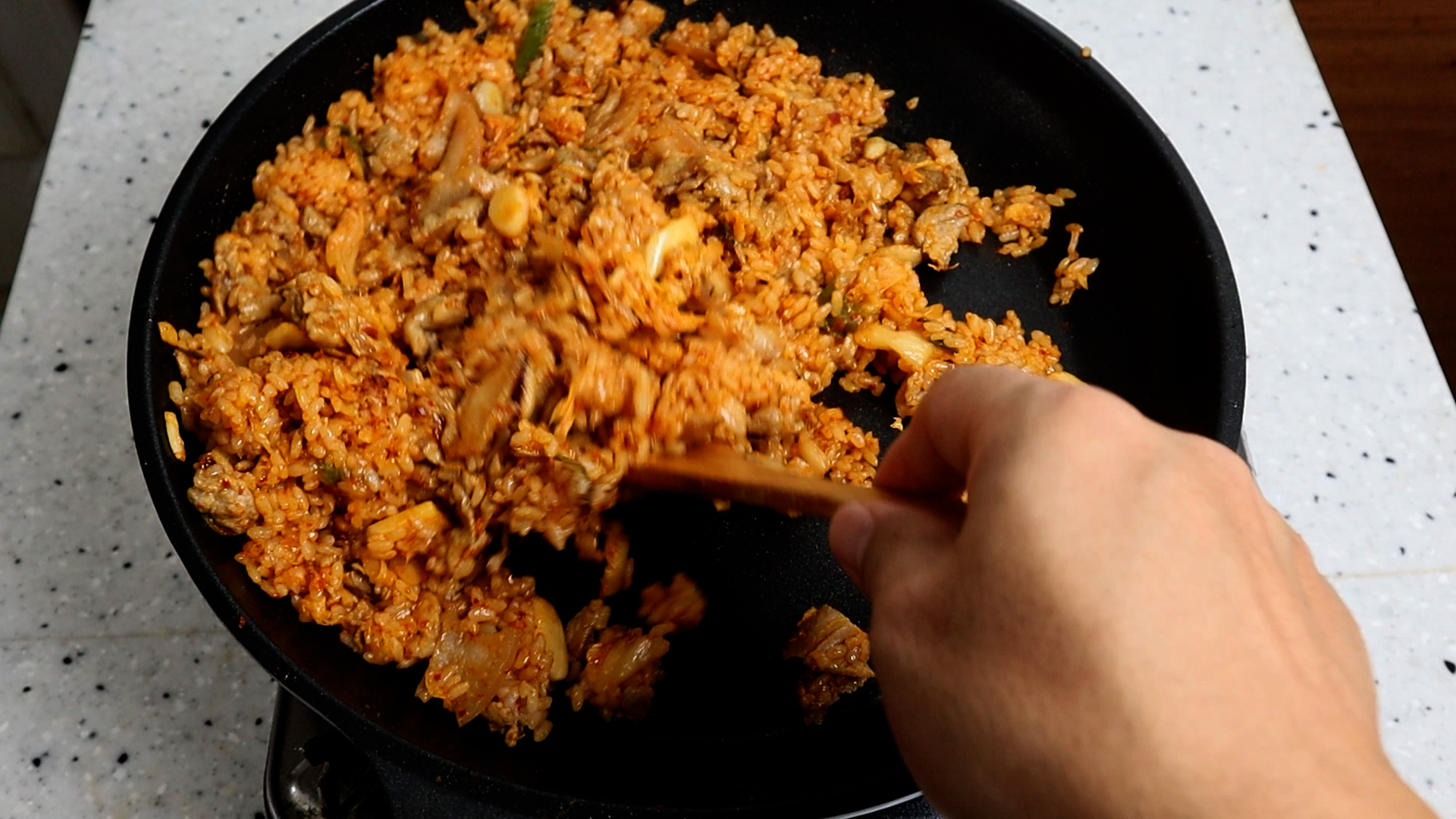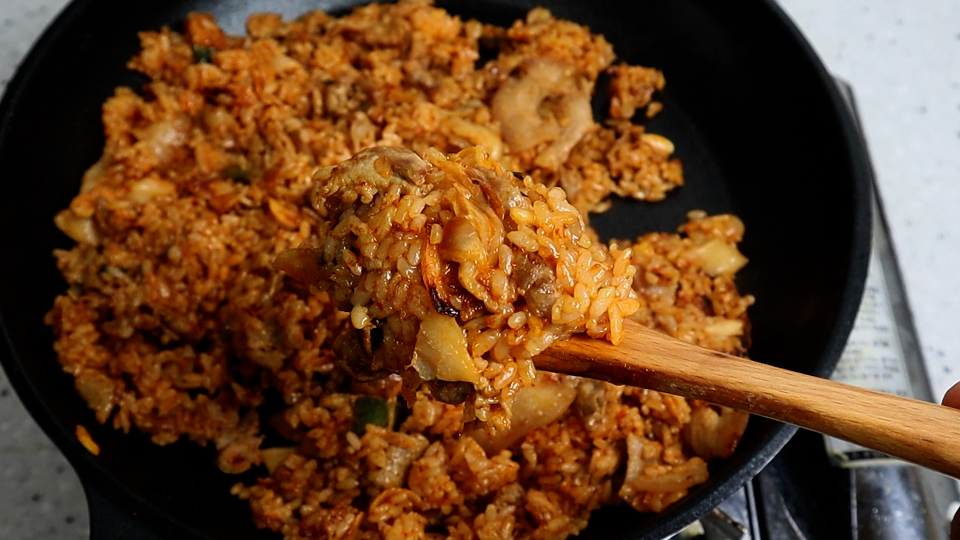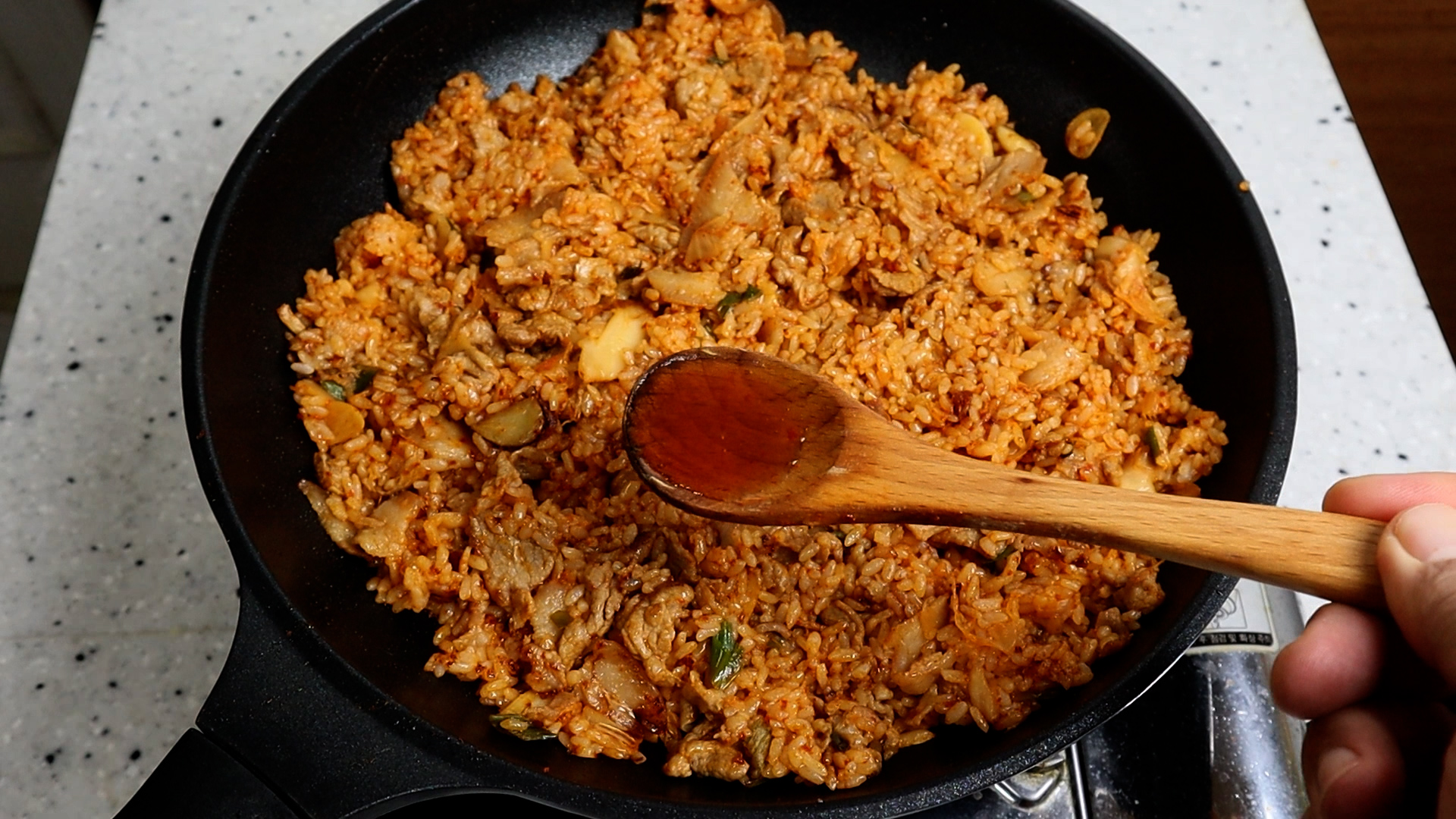 21. 30~40초 눌렸다가 골고루 섞으며 10초 정도를 볶아주세요. 그리고 이걸 2~3차례 반복해주세요. 밥이 타지 않는 한도내에서 눌리는걸 많이 반복하시면 더욱 진하고 맛있는 볶음밥이 됩니다!