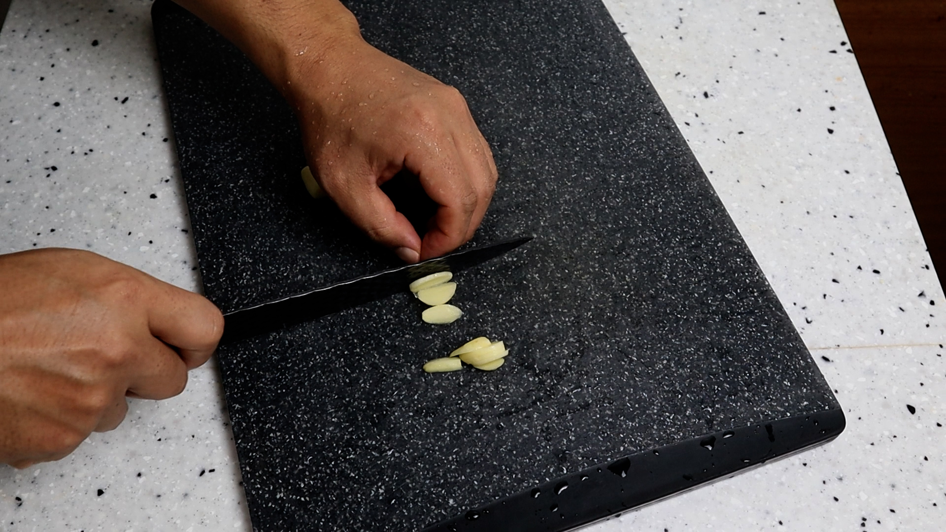 1. 마늘 4~5알을 편으로 잘라주세요. 고깃집에서 고기 구워 먹고 나면 불판위에 한상 마늘구운게 남아있죠. 알게 모르게 그 마늘향이 볶음밥에 한몫한답니다.