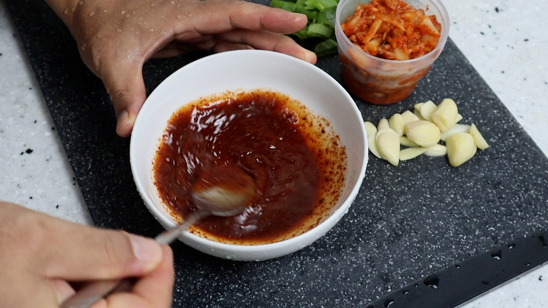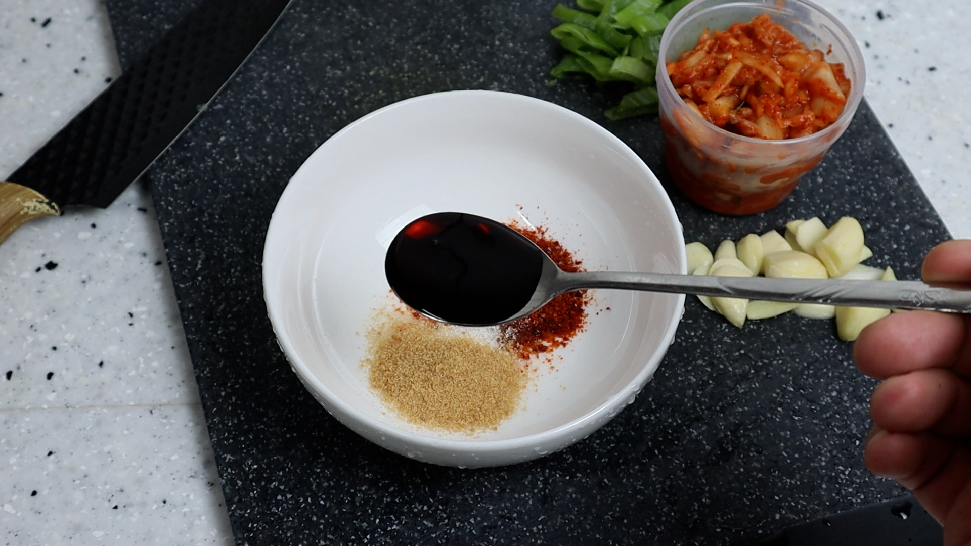 5. 양념란에 적힌 재료를 분량껏 전부 넣어주세요. 고춧가루가 살짝 들어가면 밥을 볶았을때 진하고 깊은 맛을 더할수 있어요.