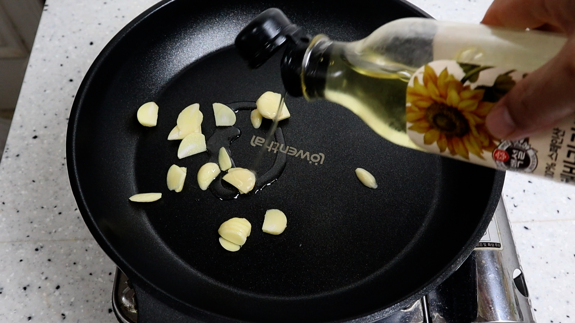 13. 불을 약불로 올려주고 마늘을 대략 2분 정도 구워주세요.