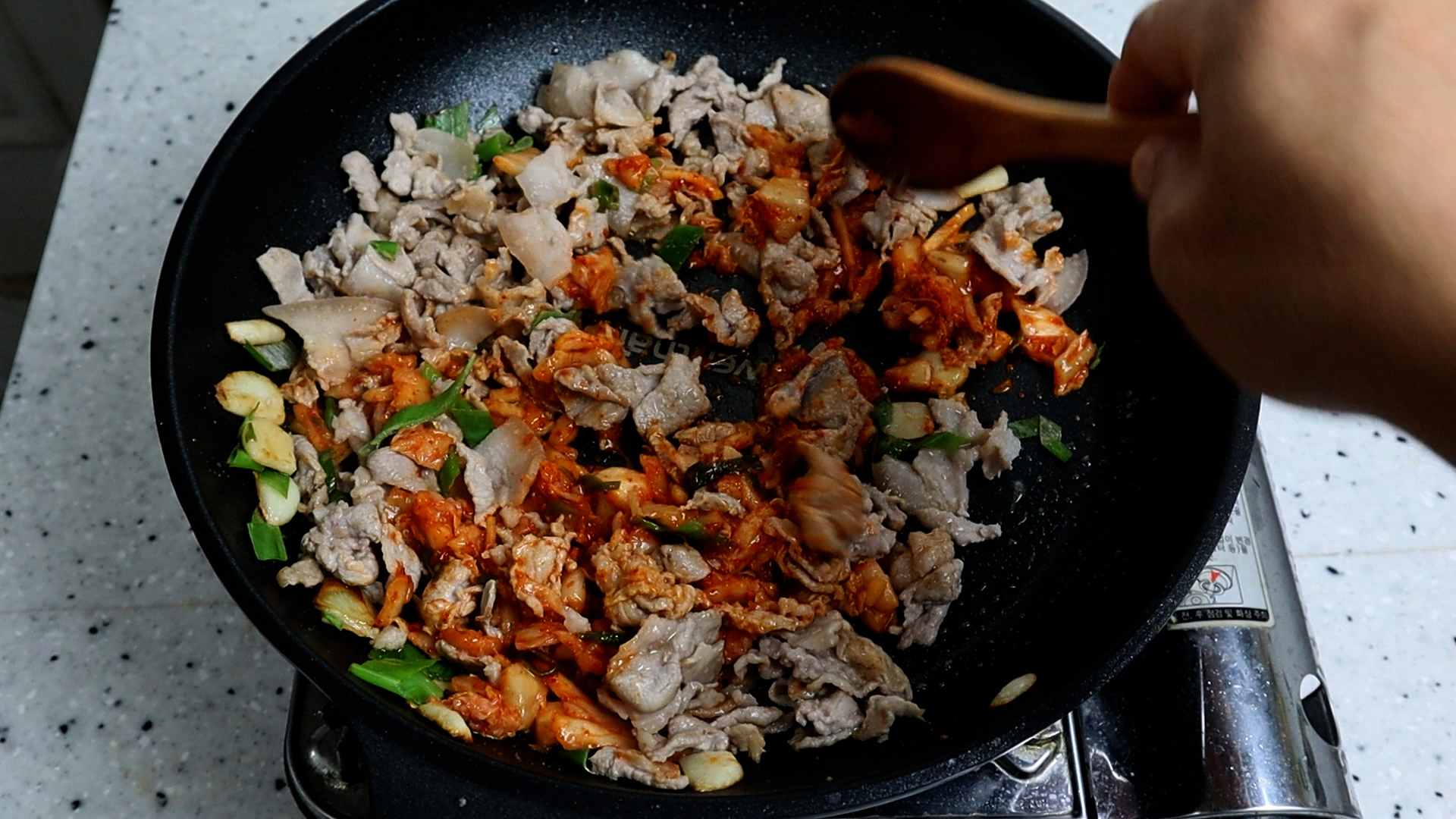 18. 고기를 자른 다음 김치를 넣고 1~2분 볶아서 김치맛을 찐! 하게 올려주세요.