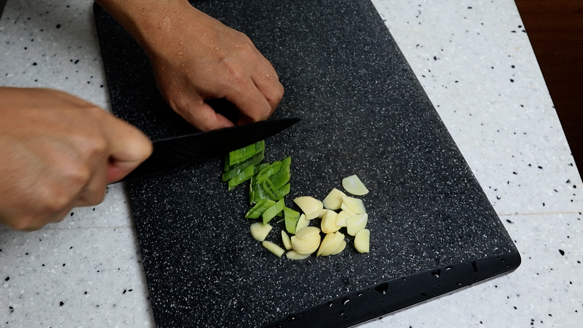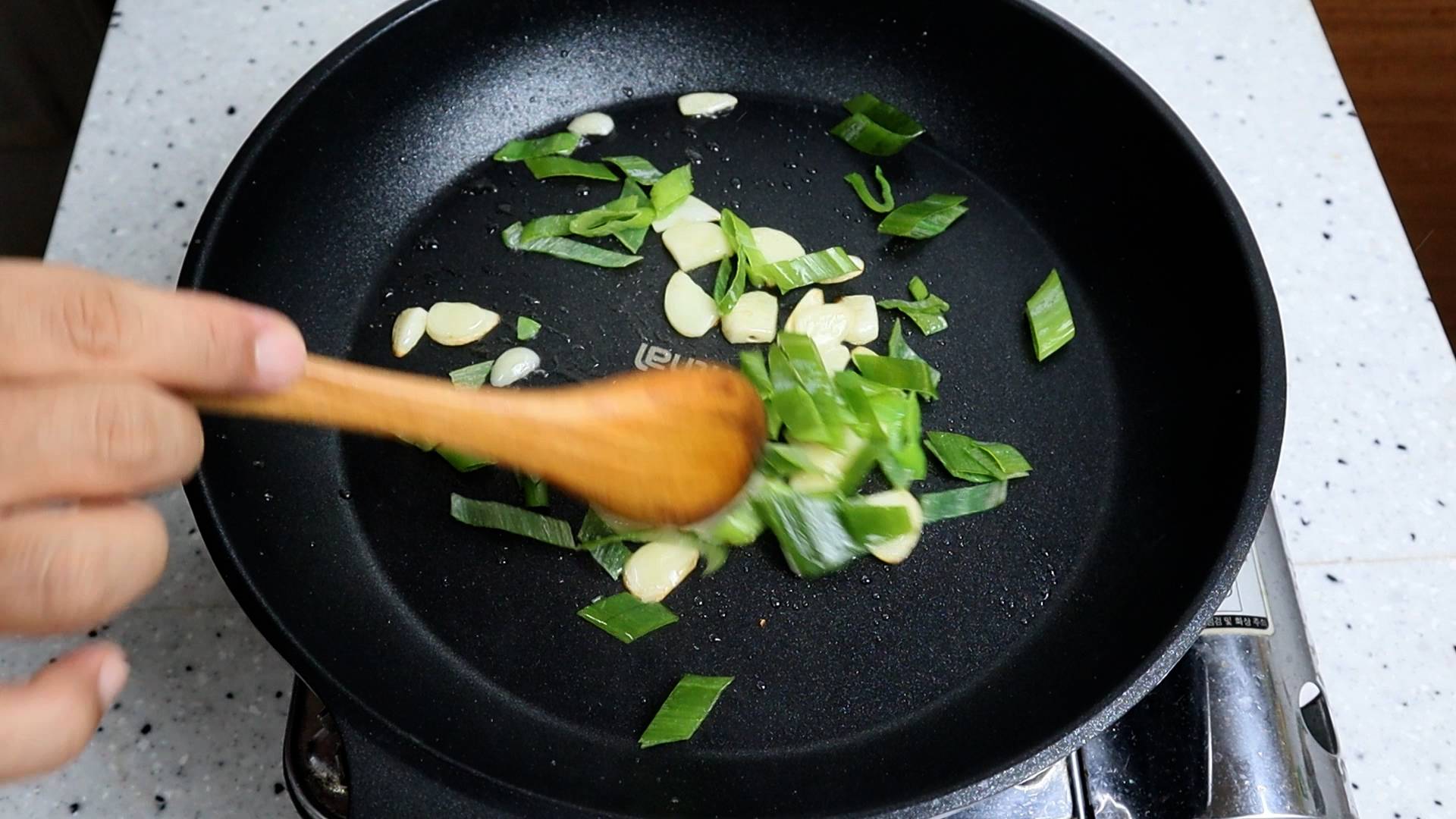 14. 마늘익는 향이 올라오기 시작하면 대파를 넣고 약불 유지하고 대략 30초를 볶아주세요.