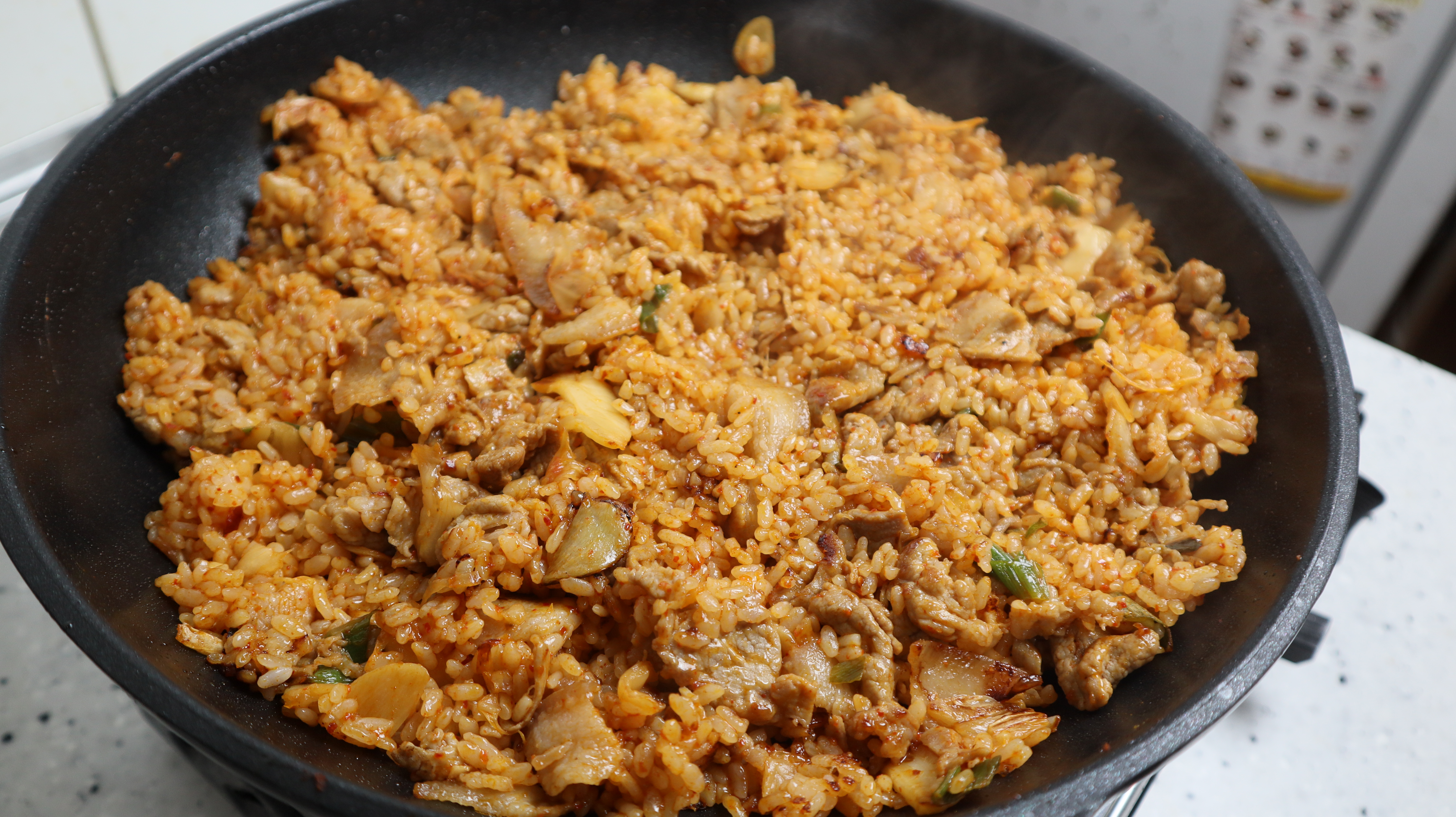 20. 양념넣고는 불을 중불로 줄이고 2분 정도를 볶아주다가 밥을 팬위에 넓게 펼쳐서 30~40초 가만히 두세요. 이때 양념과 함께 눌려지는 밥이 진국이죠! 그래서 좁은팬보다는 팬싸이즈가 커서 밥알이 눌리는 면적이 최대한 큰걸 쓰시는게 좋아요
