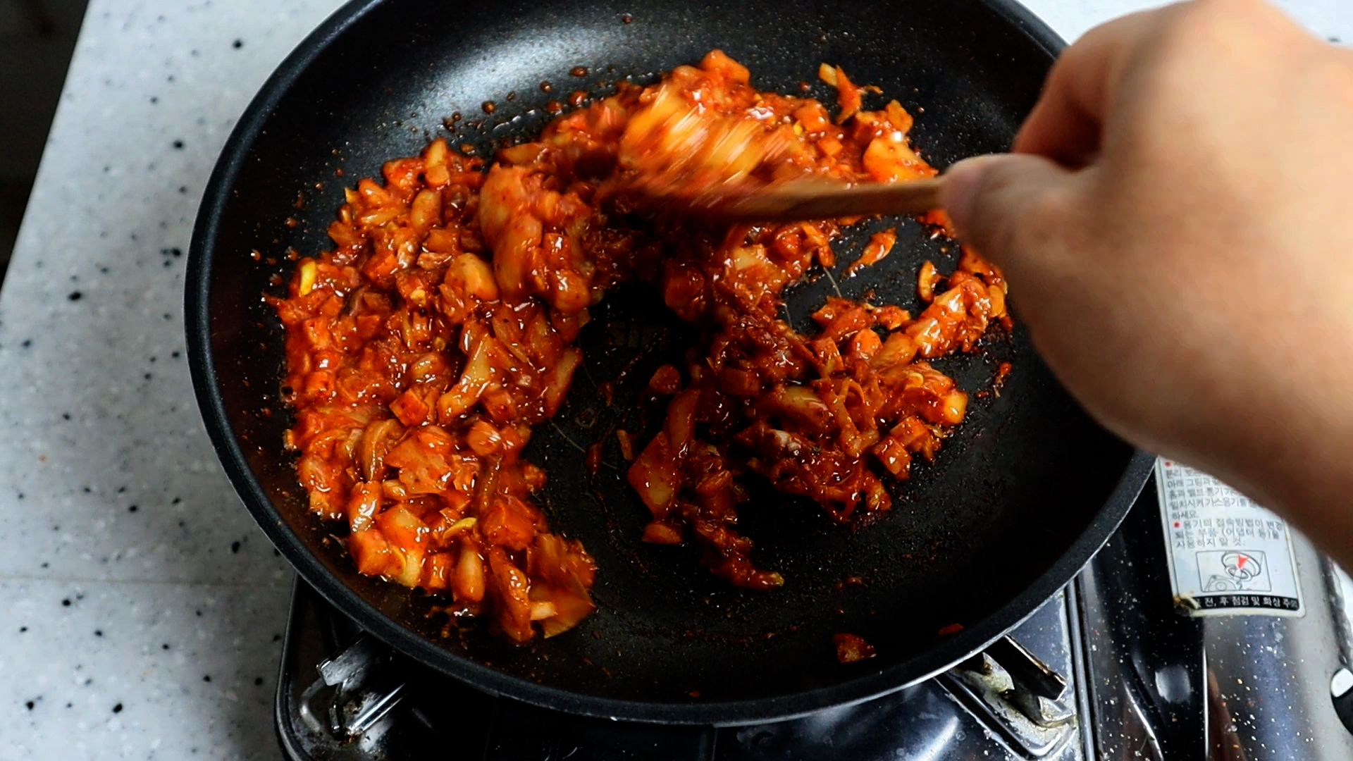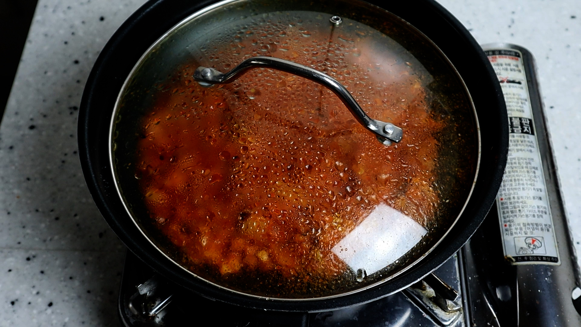 13. 볶은 김치를 다시 골고루 펴서 뚜껑을 덮고 30초를 방치해주세요.