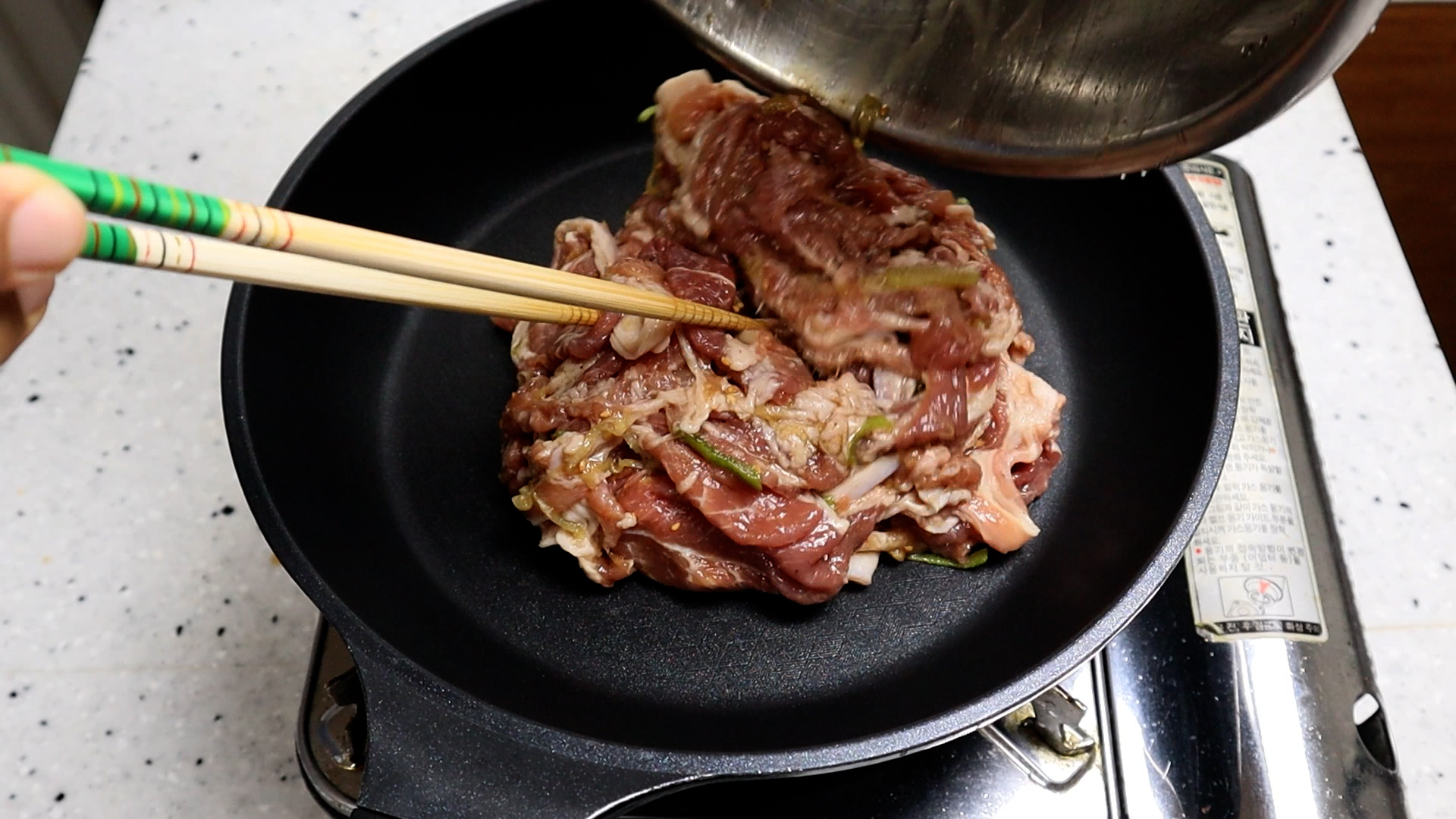 13. 코팅팬을 강불로 달궈서 재워둔 고기를 올려주세요. 양념육은 강불로 달군 팬에 하면 안된다는 분들 계신데 이렇게 가벼운 양념으로 재워 숯불구이용으로 만든 양념육은 강불에 바로 구워도 양념이 빨리 타버리거나 하는일은 없답니다