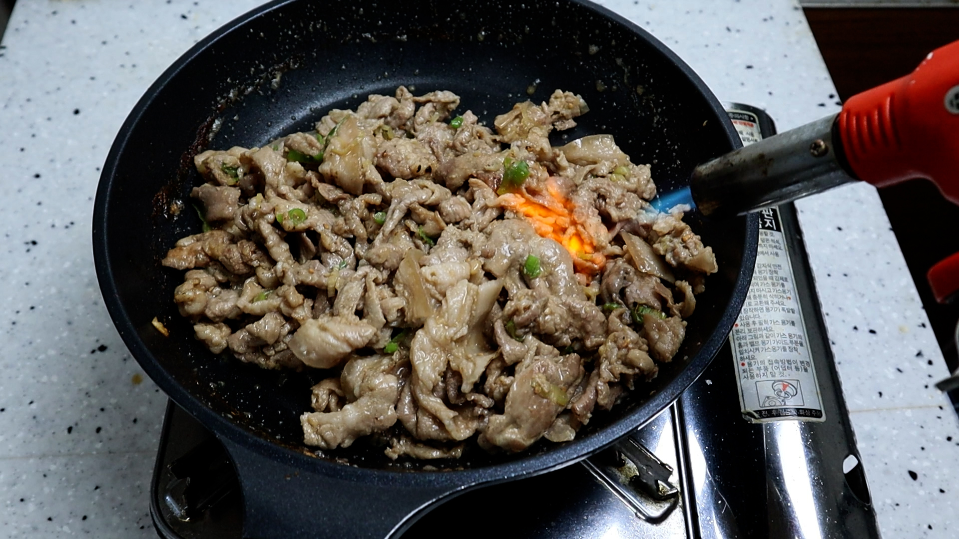 14. 맛있게 구운고기는 그냥 익혀 먹어도 맛있지만 토치질을 골고루 해서 불향을 좀 입혀주세요. 원래 숯불의 직화에 구워먹는 베이스로 만들어진 양념이라 집에서 숯을 피울순 없으니 토치질을 해주면 제법 좋습니다!