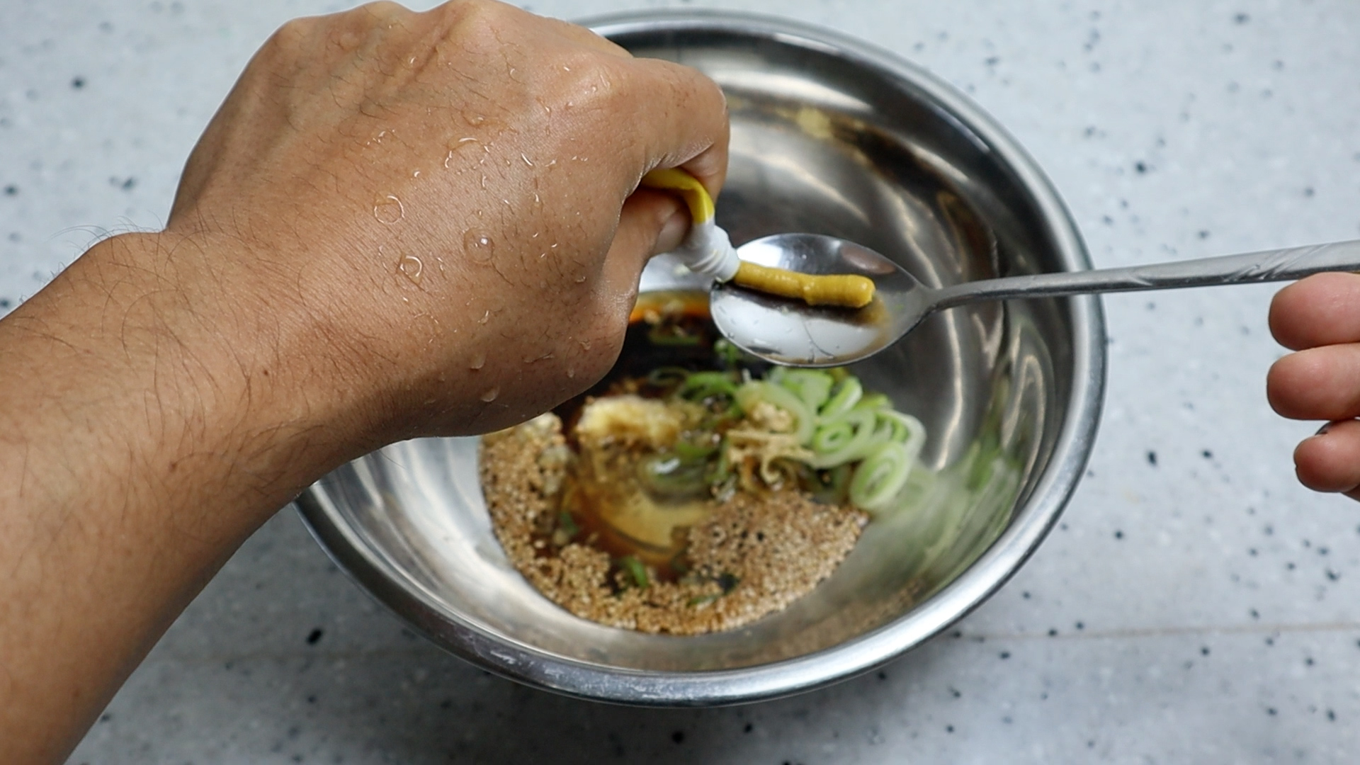 8. 그리고 오늘의 히든카드! 연겨자를 숟가락에 2/3정도 길이만큼 짜넣어주세요. 무게로 대략 1g 정도가 나올거에요.
