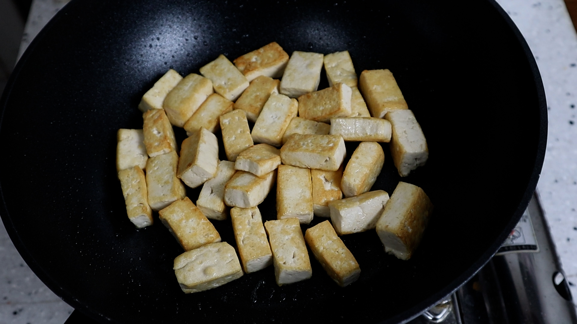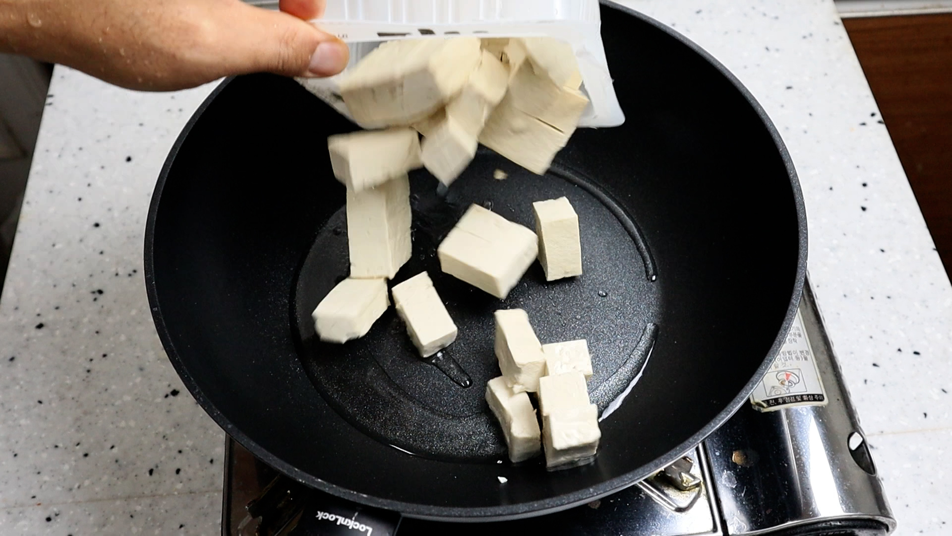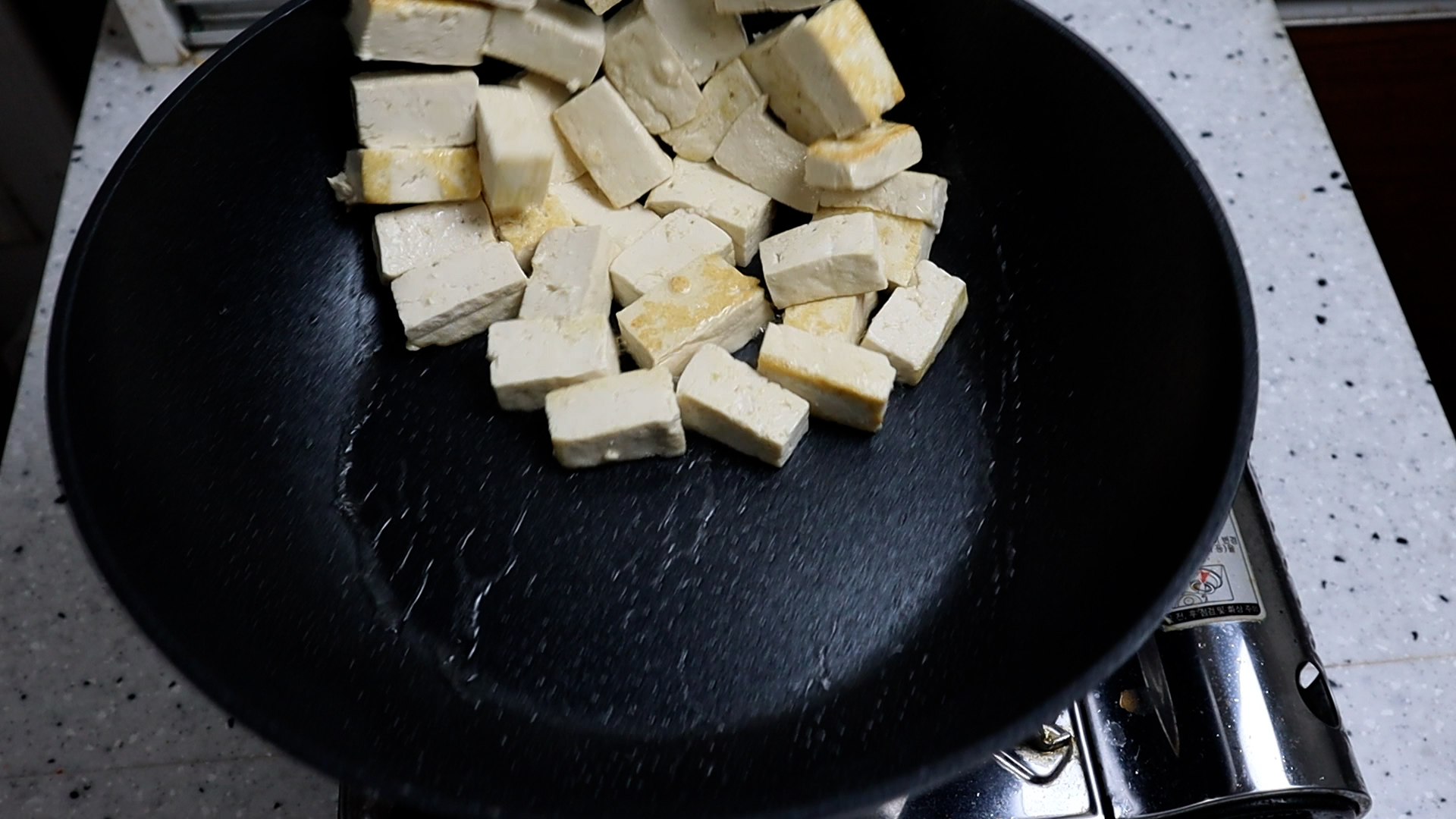18. 웍에 식용유를 넣고 중불로 달궈준 다음에 잘라놓은 두부를 넣어주세요.