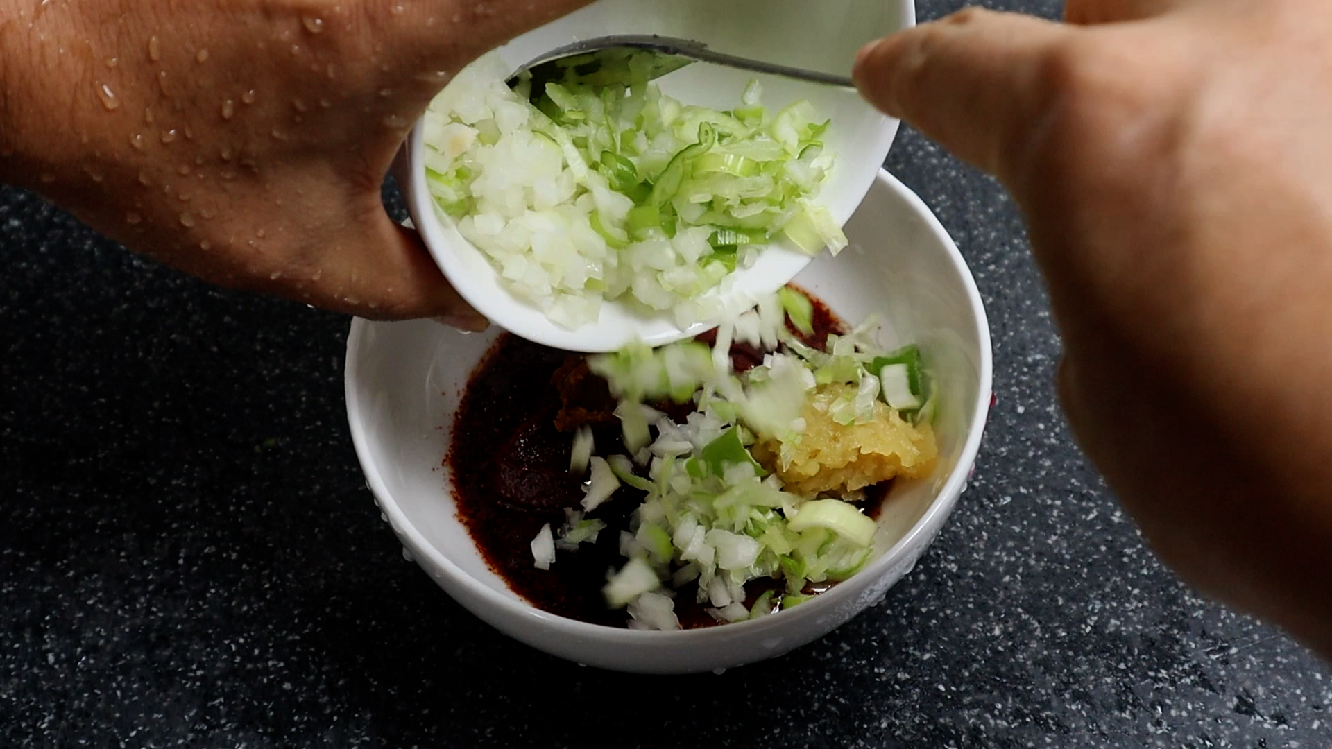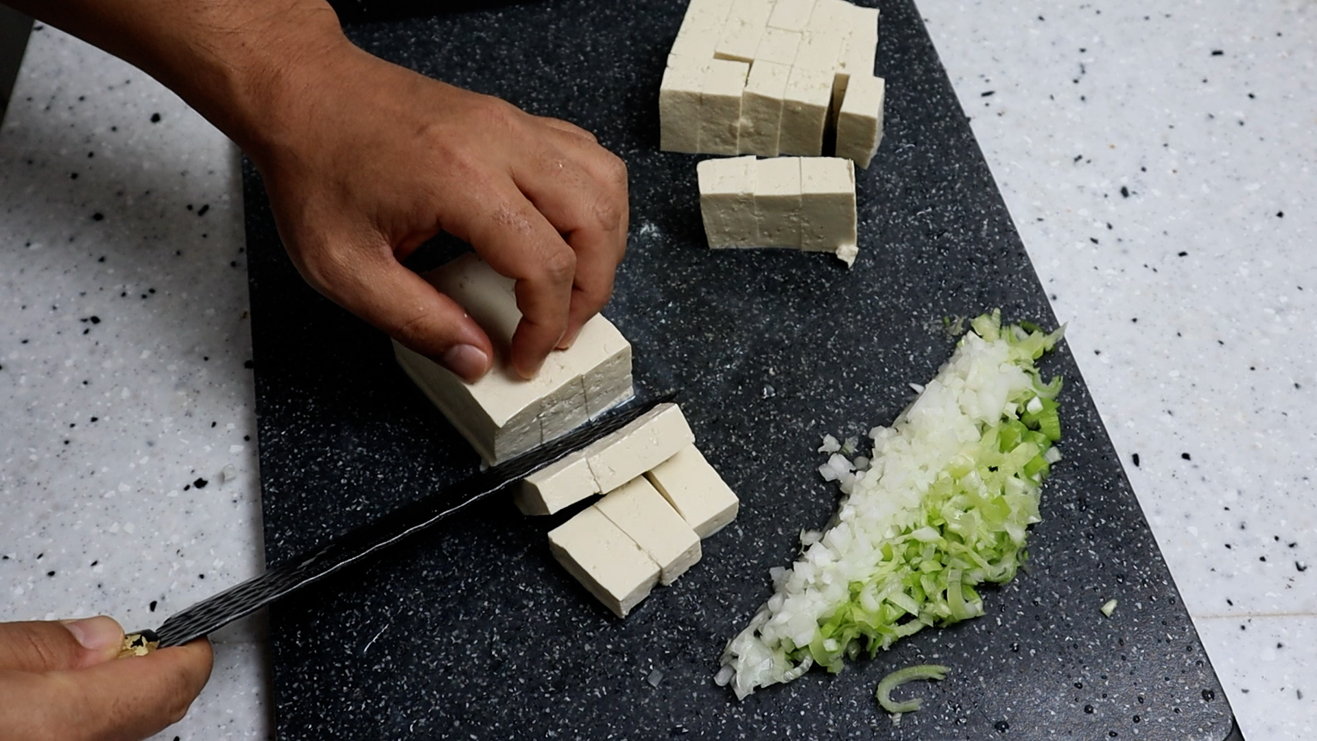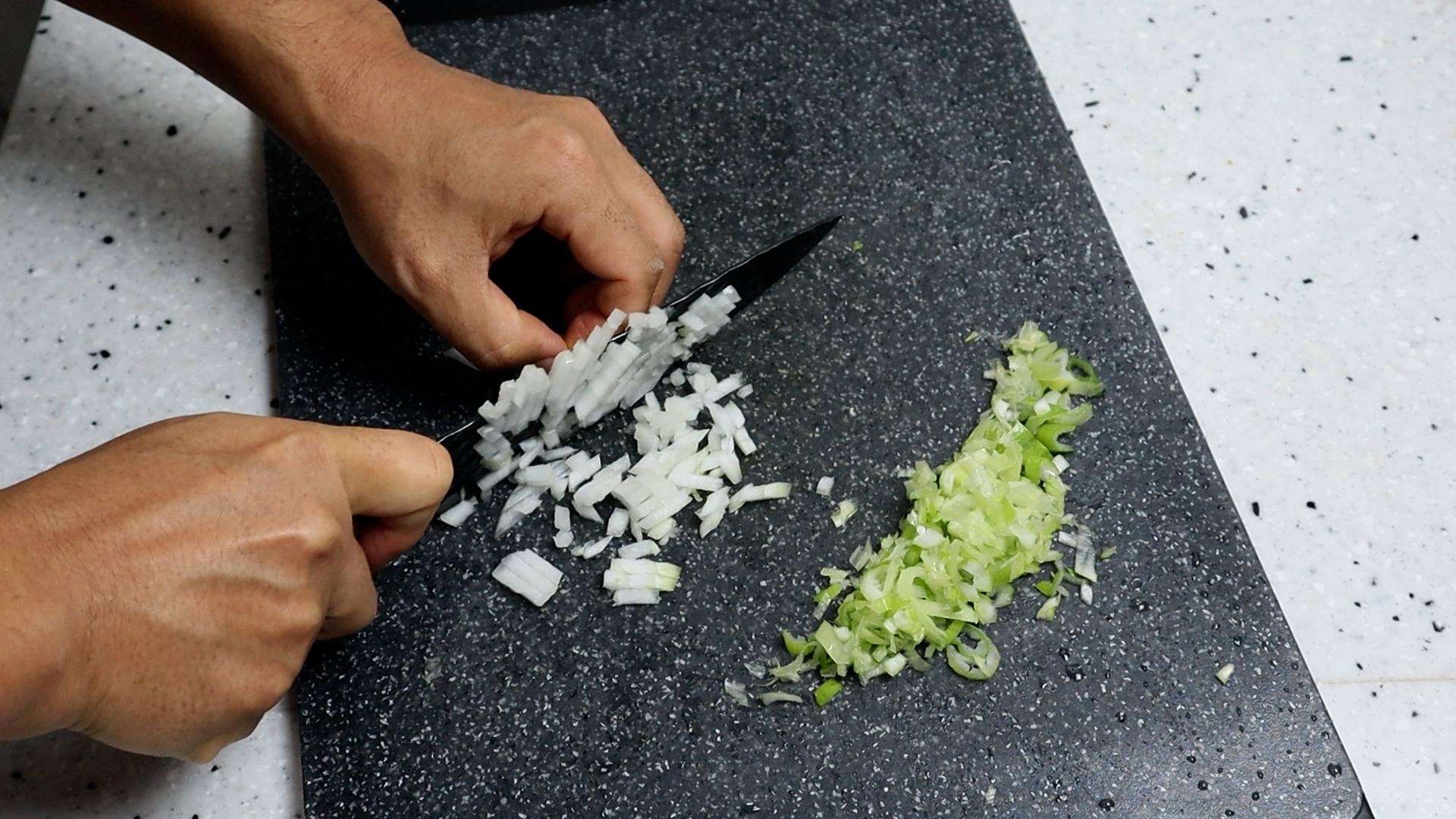 2. 양파도 대파와 비슷한 무게가 나오게 잘게잘게 썰어주세요. 썰고나서 너무 입자가 크다면 다져주는거 잊지마세요! 빠르게 볶아 낼꺼라 양파 입자가 작아야 양파 단맛이 빠르게 빠져 나옵니다.