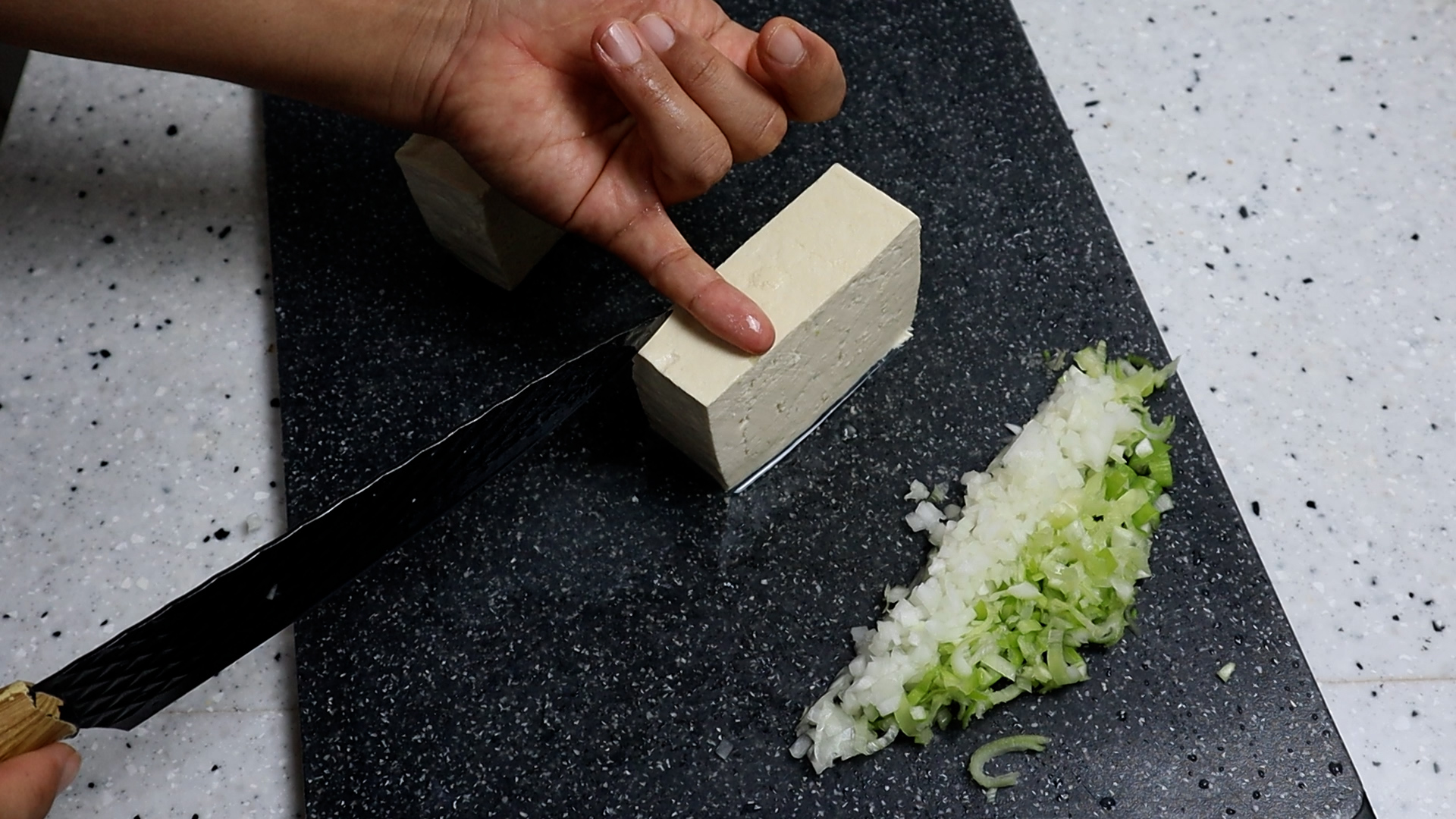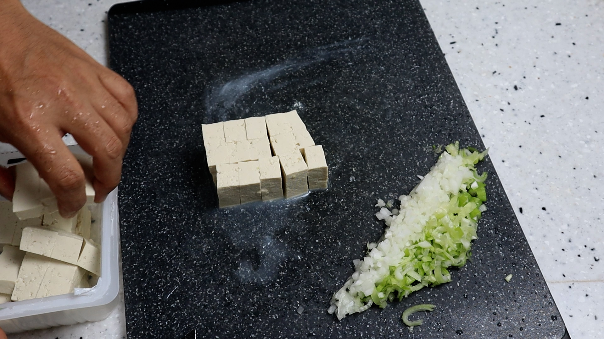 3. 두부는 단단한 부침용 두부 2/3모 정도를 준비해서 폭은 새끼손가락 한마디 보다 좀 크게 2~3cm로 썰어주세요. 두부는 업체마다 1모 무게가 상이하니 무게를 보고 적당한 크기로 잘라주세요.