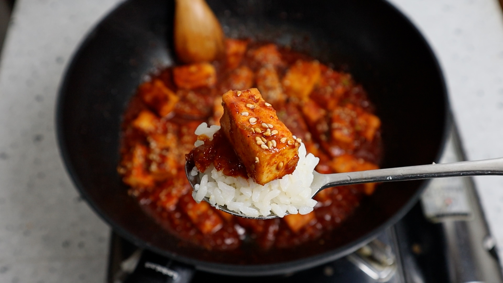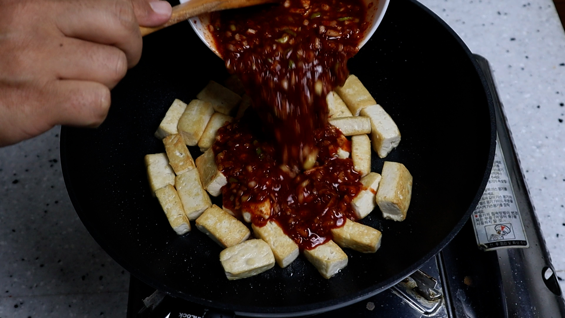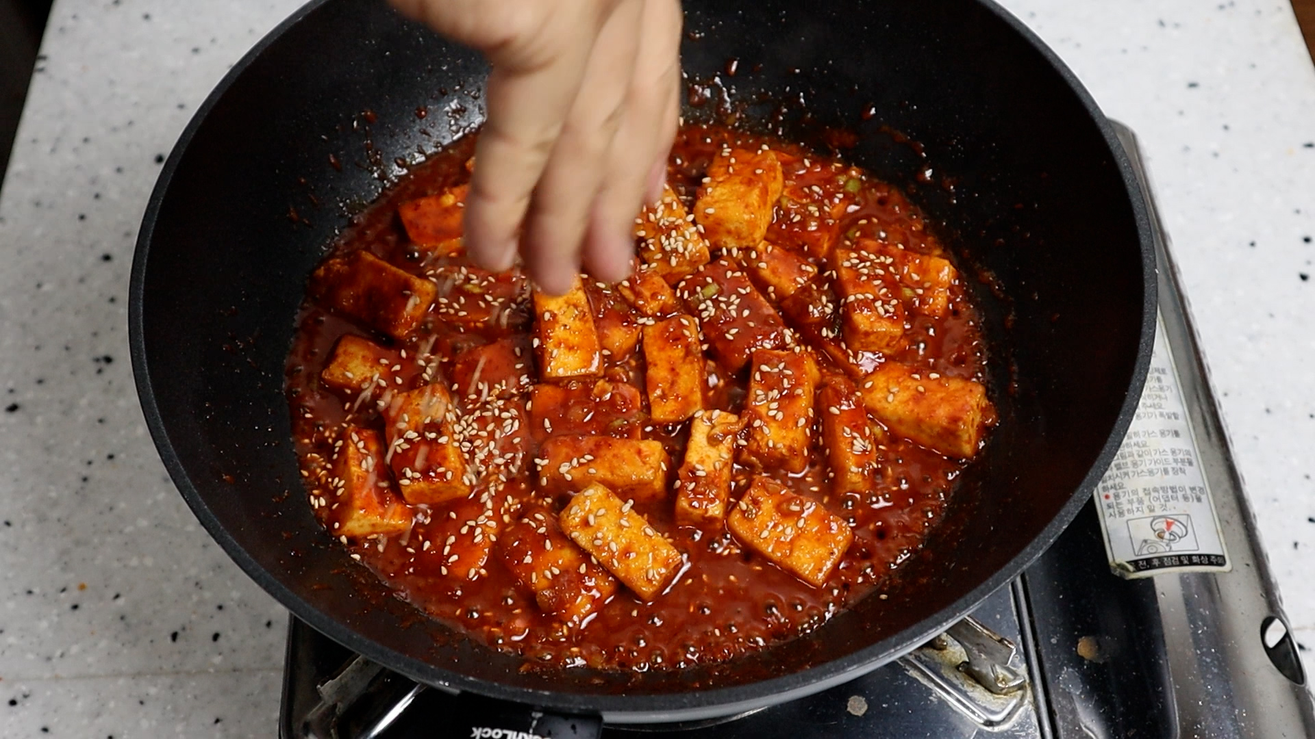 22. 단단한 두부를 한번 튀겼으니 잘부서지지 않으니 마음 놓고 슥슥슥~ 섞으면서 양념이 꾸덕꾸덕해질때까지 대략 3~4분을 볶아주세요.