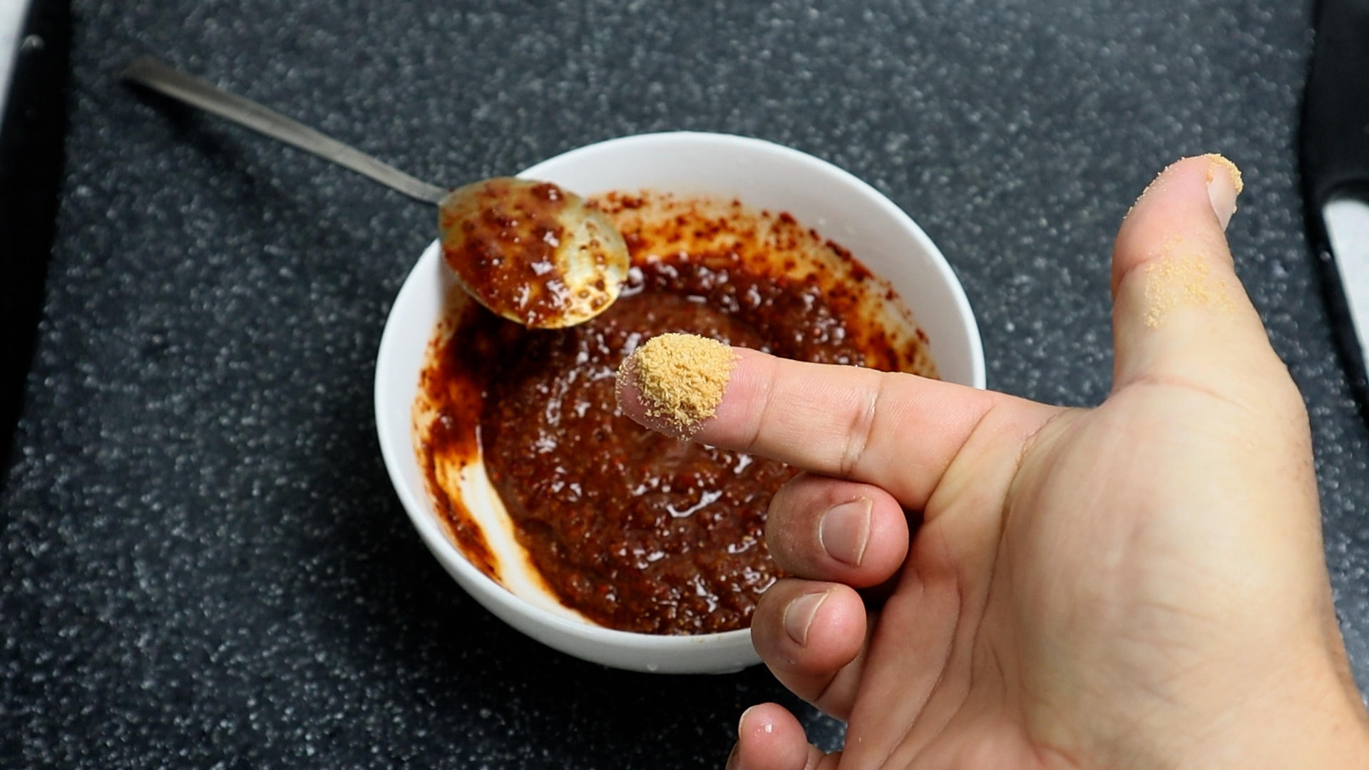 8. 소고기 다시다는 생략해도 괜찮지만 이정도씩 집어서 2꼬집을 넣어보세요. 그러면 좀더 맛있는 쌈장맛을 볼수 있습니다.