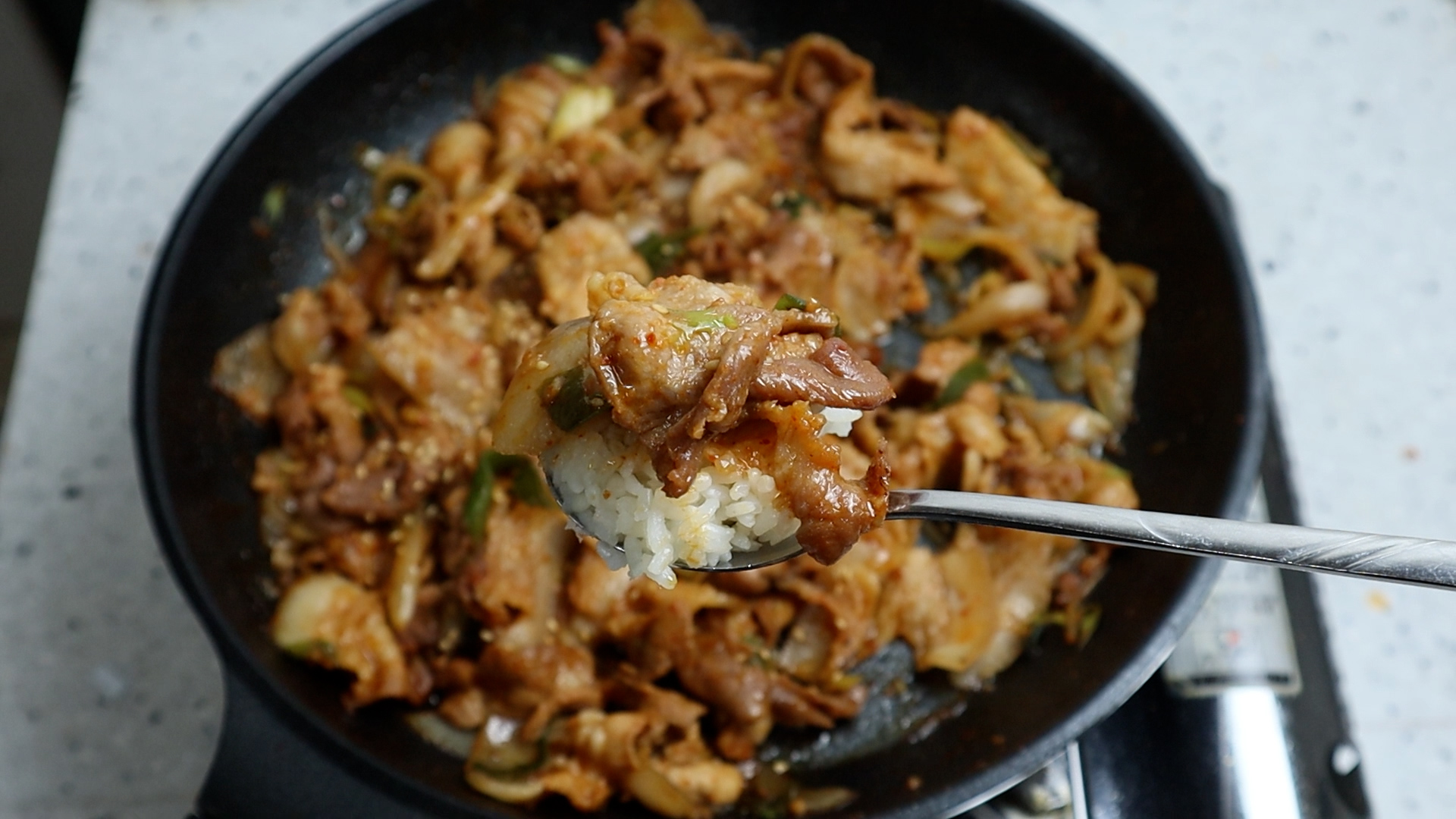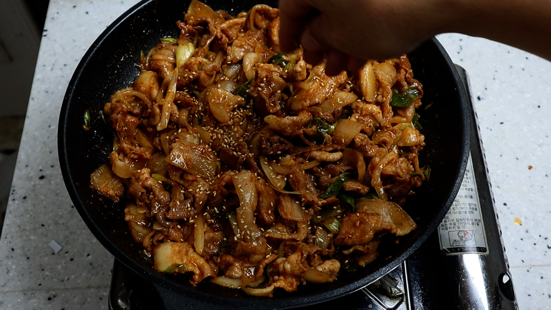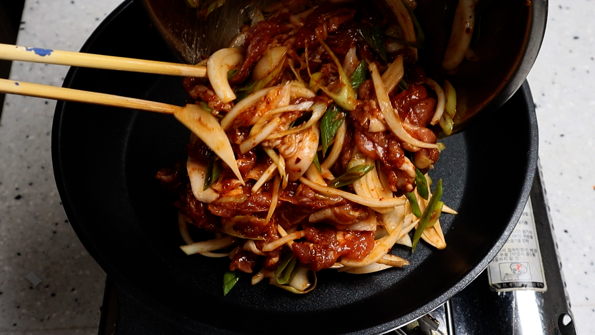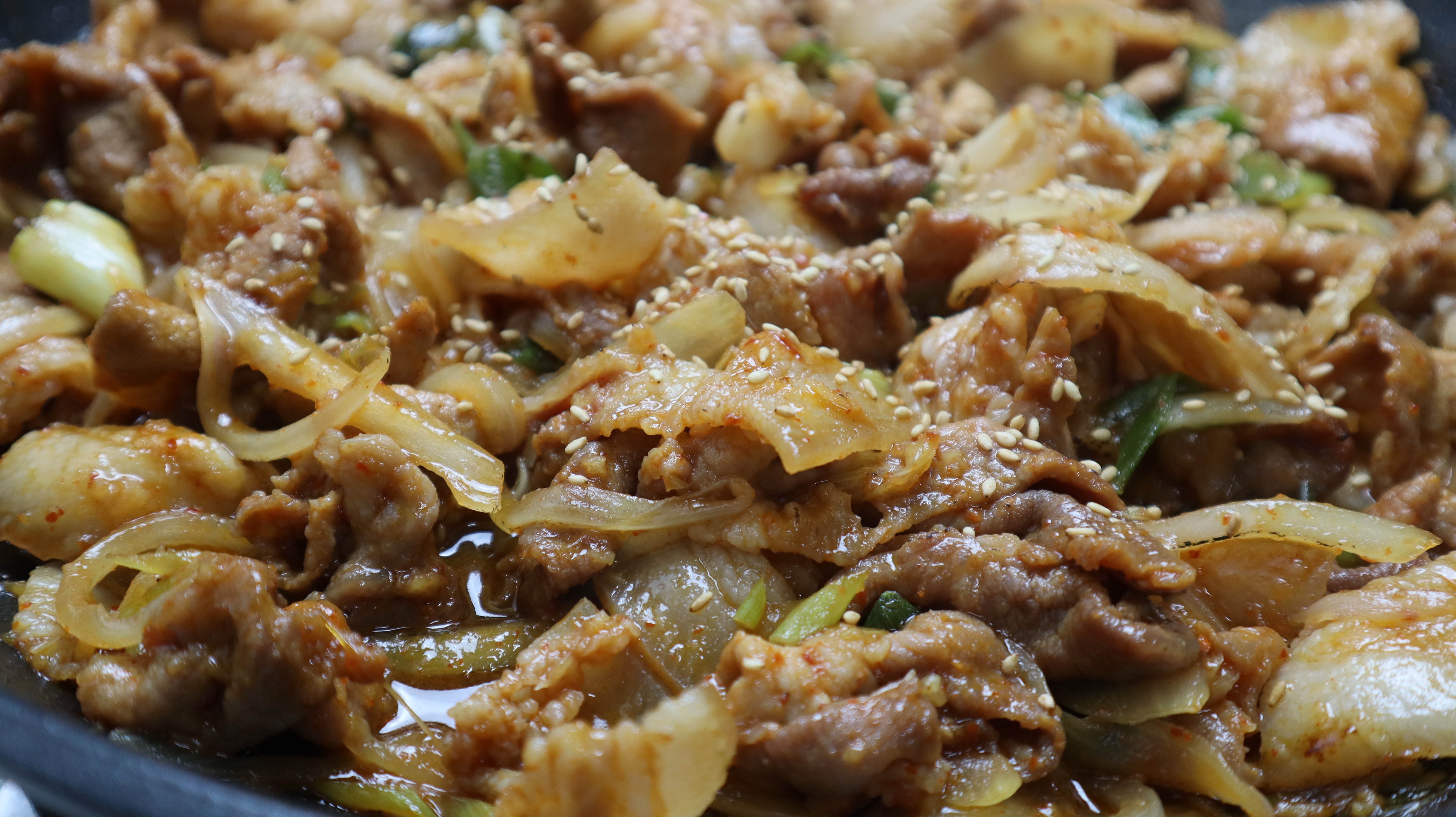 14. 가능한 넓은 팬을 강불로 달궈서 고기를 부어주세요. 팬이 넓어서 굽는동안 나오는 수분을 바로바로 날릴수 있어야 집에서도 바싹한 느낌의 돼지불백을 만들수 있습니다!