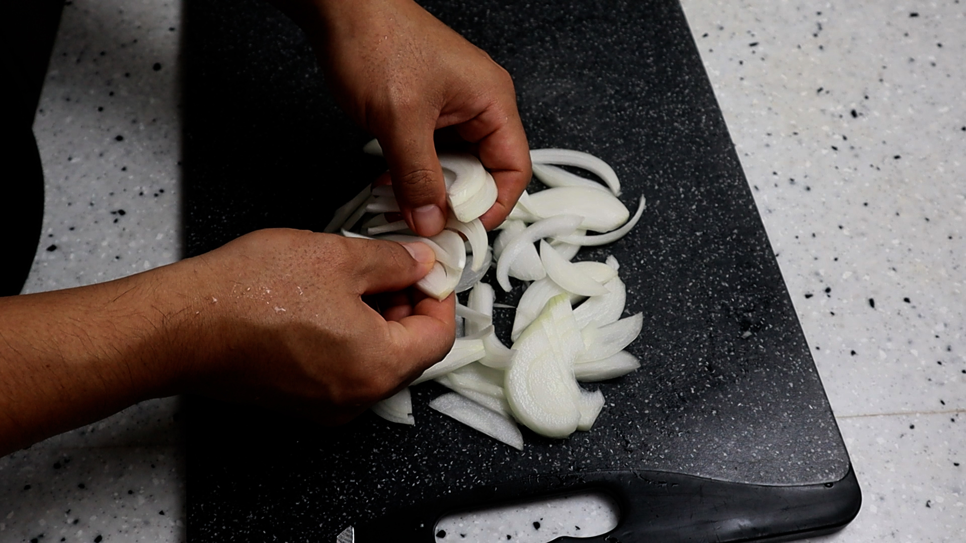 1. 양파 작은거 1개 또는 큰거반개를 1cm 간격으로 썰어주세요. 썬다음에 미리 낱알로 뜯어 놓으면 나중에 볶을때 뭉친 양파가 없어서 좋습니다.