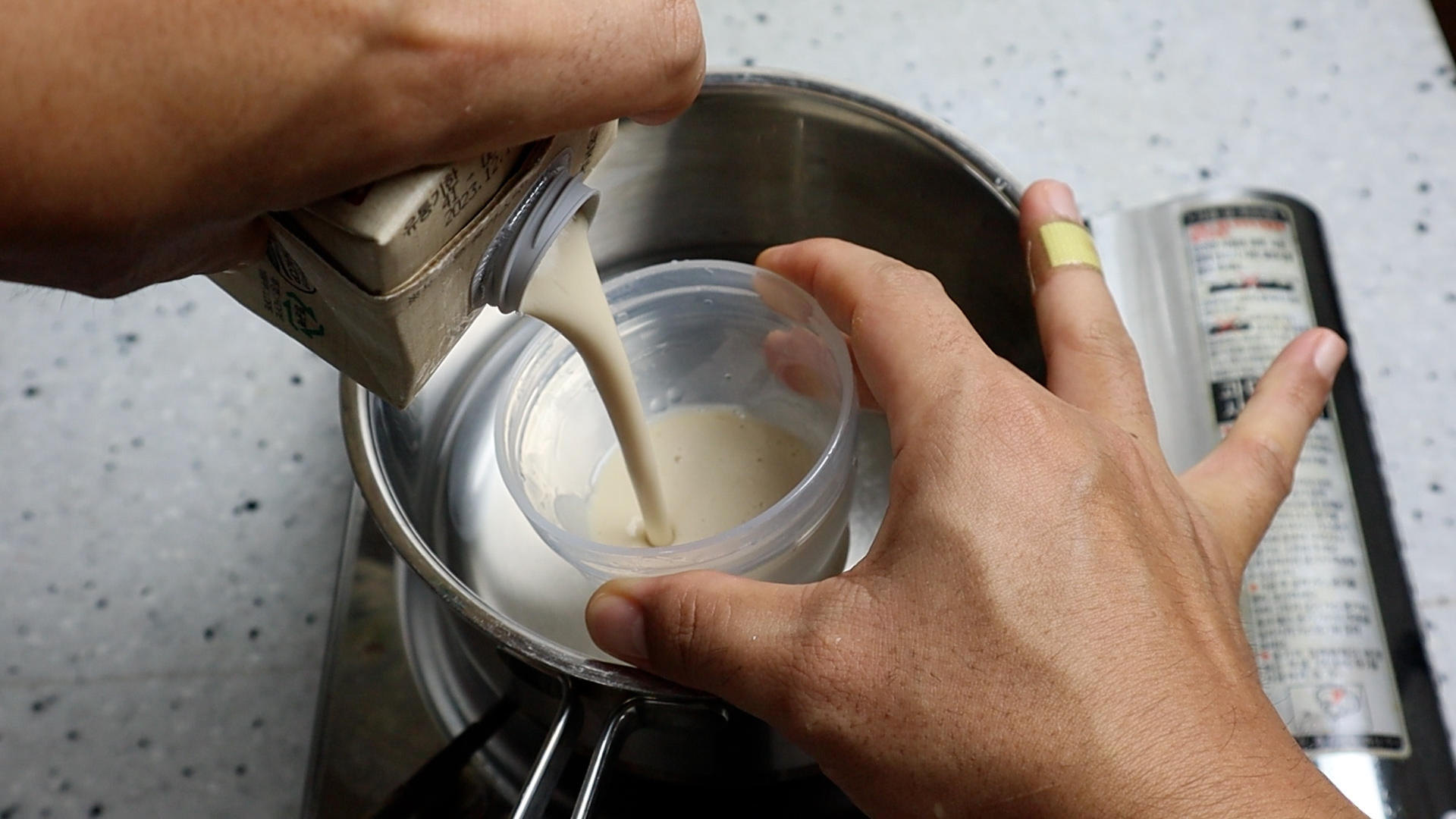 3. 콩국물 200cc 1컵 부어주세요. 콩국물은 소금이나 설탕이 가미되지 않는 100% 콩국물을 사용하셔야 합니다.