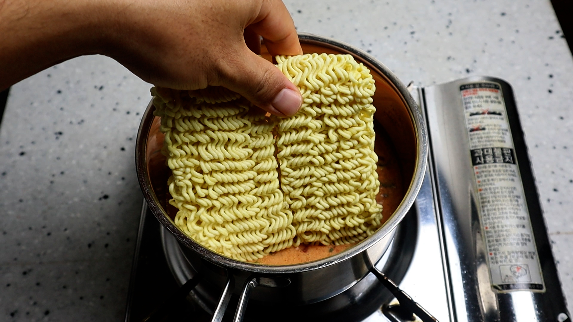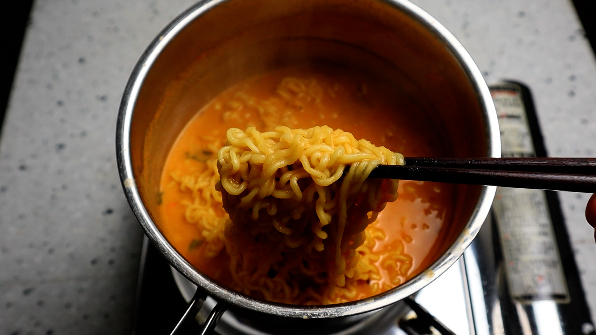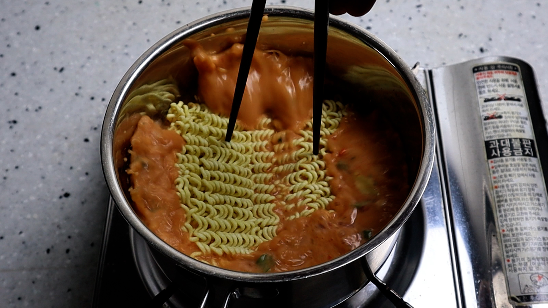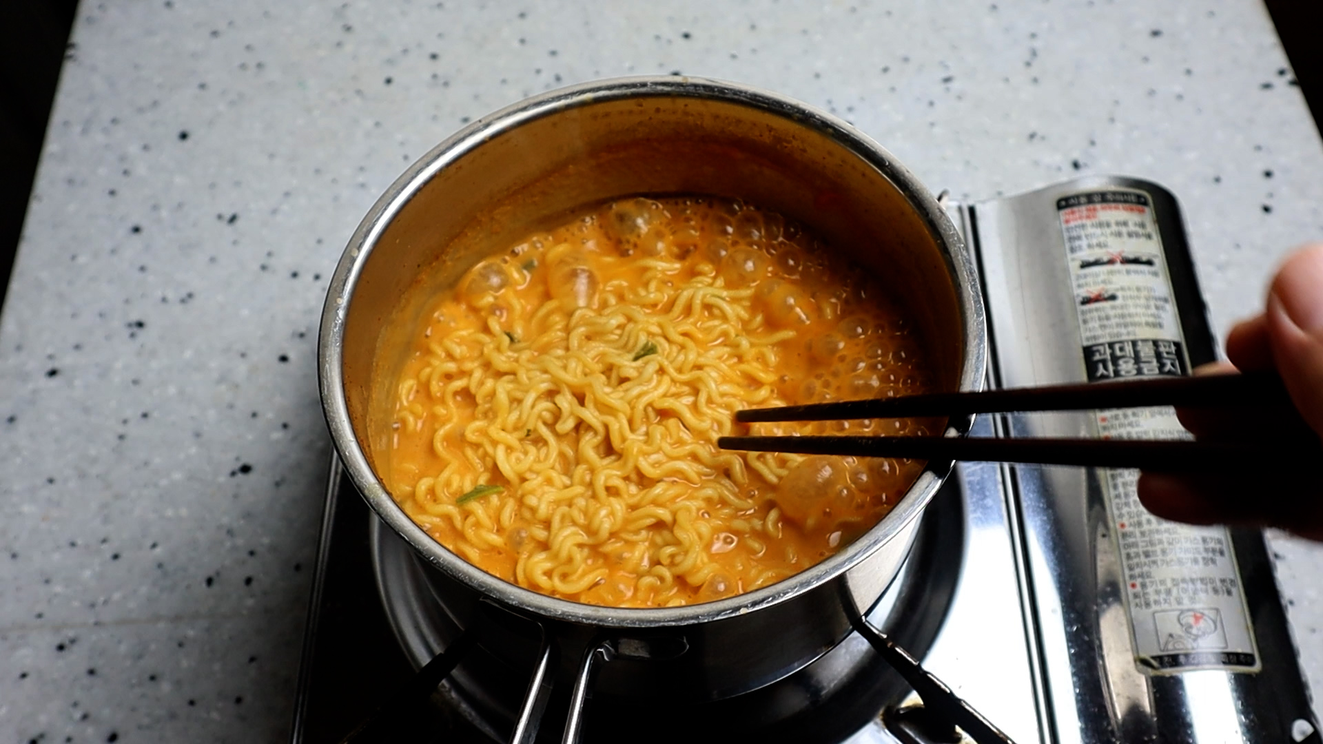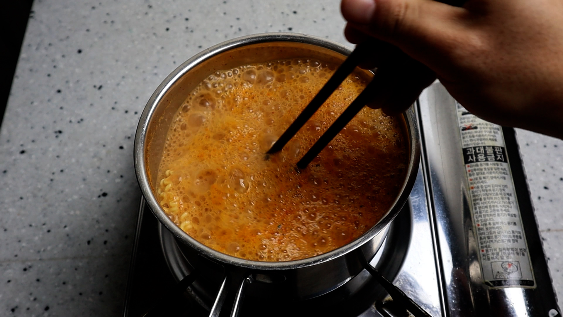 8. 중간중간 한번씩 저어가면서 라면 설명서에 적힌 시간만큼 끓여주세요.