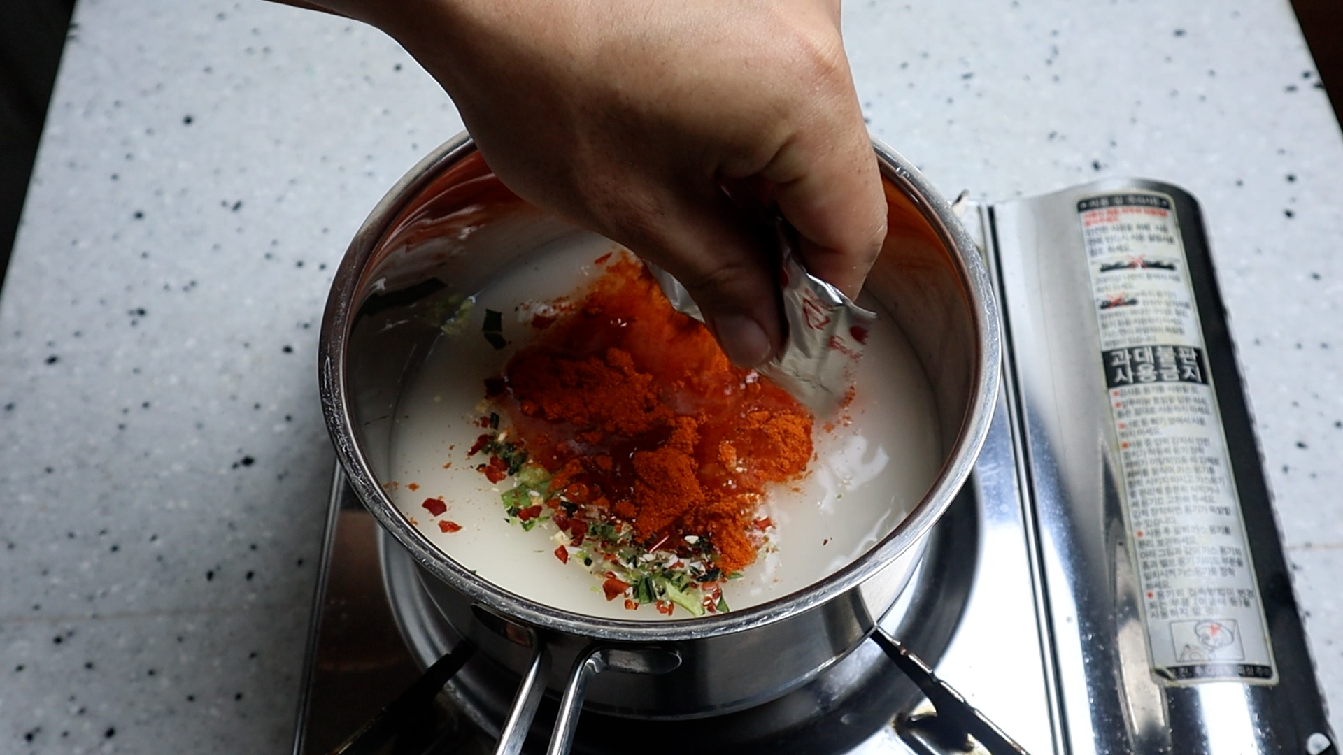 5. 콩국을 부어준 다음 가루스프와 건더기스프도 전부 넣어주세요.