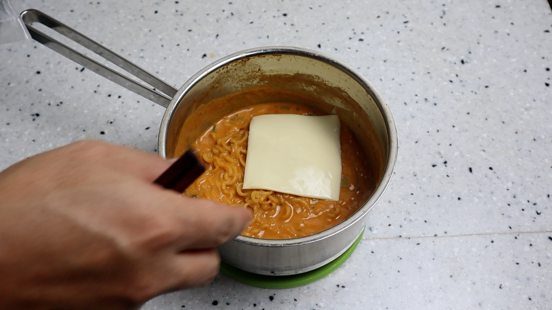 10. 기호에 따라 치즈 1장을 넣고 골고루 섞어 녹여보세요 또다른 별미로 즐기실수 있습니다. 제 입맛엔 치즈 들어가기 전이 쪼오~~꼼더 맛있었습니다!