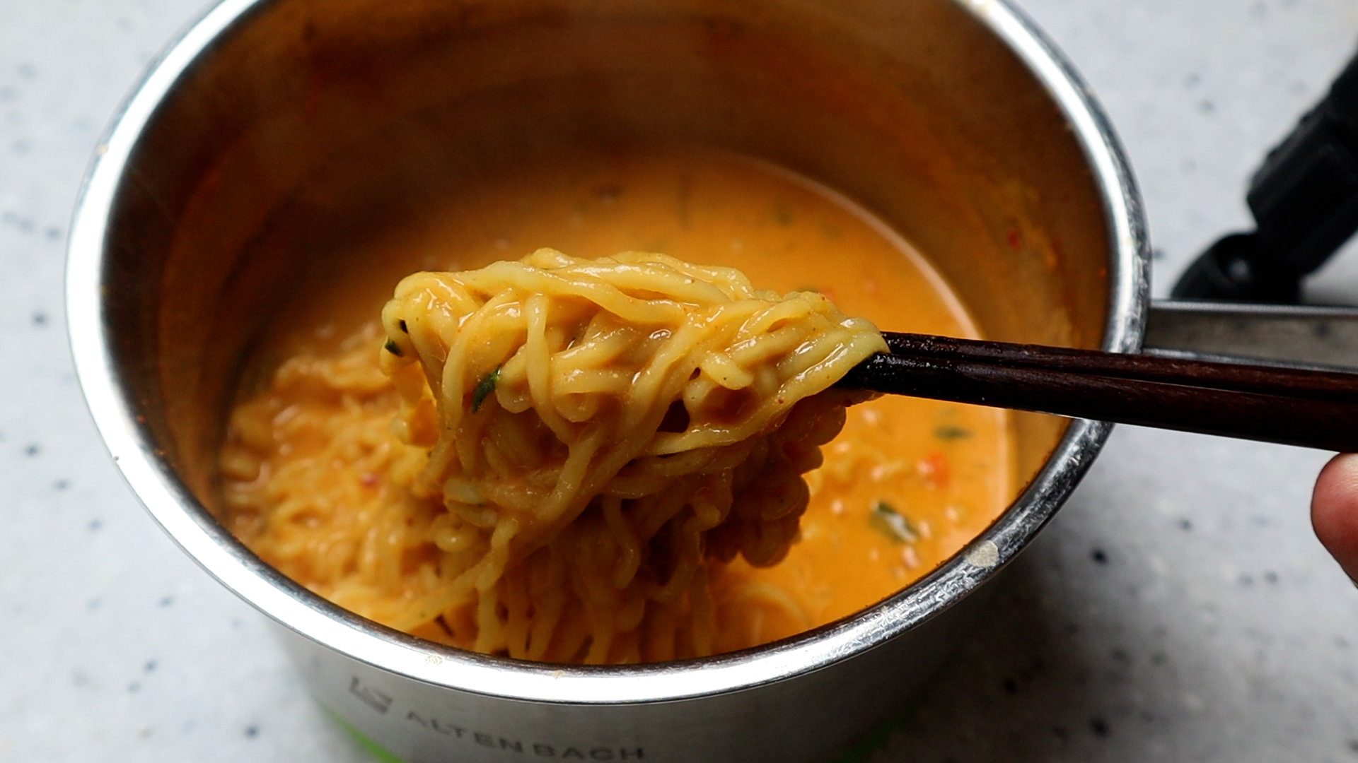 9. 그리고 완성 후 비쥬얼을 한번 보시면 콩국물 때문에 점도가 생겨서 비쥬얼리 라면과 로제파스타 그 어디 중간쯤 있는듯한 비쥬얼이 나올거에요. 맛은 아주 고소하고 깊고 진한~ 라면 맛입니다.