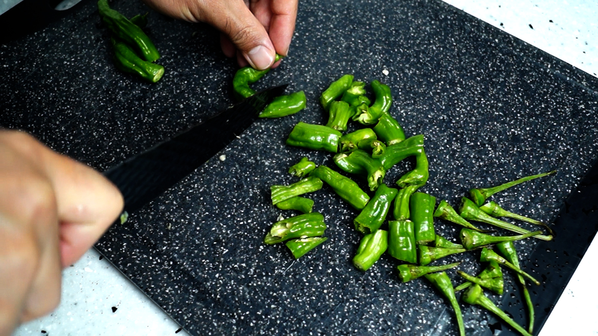 2. 꽈리고추는 사용하지 않는 꼭지는 잘라주시고 3~4등분으로 잘라주세요. 통으로 즐기는게 좋으시면 통으로 사용하셔도 됩니다.