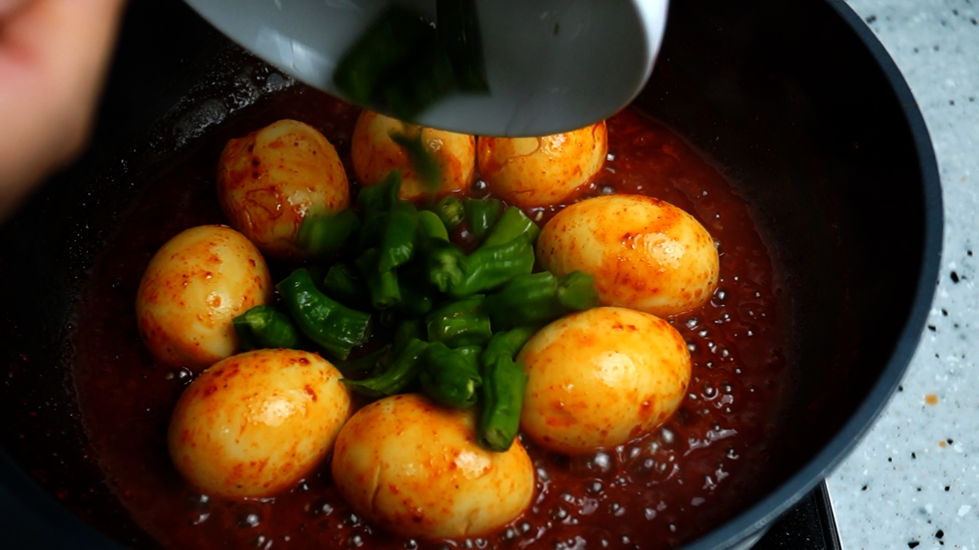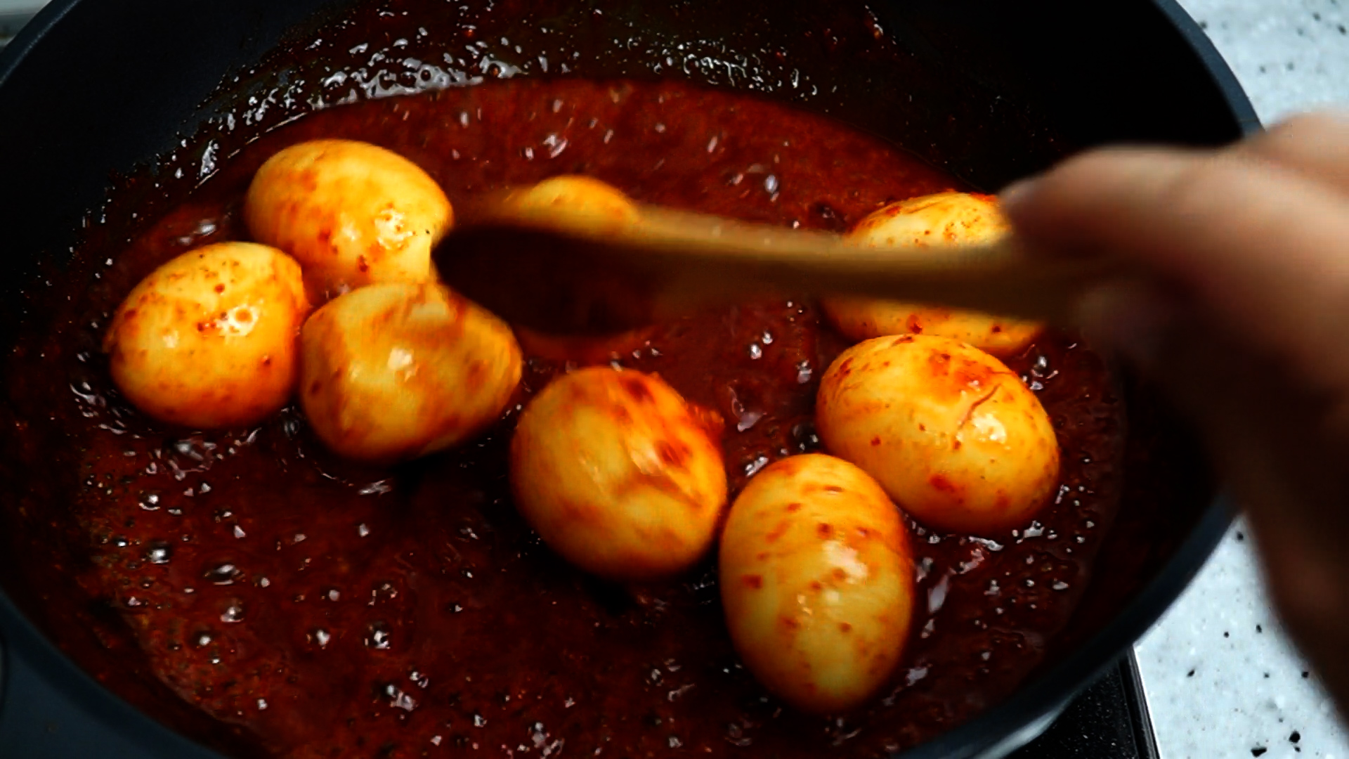 14. 강불에 양념이 끓어 오르면 계란을 전부 넣고 불을 중불로 줄인 다음 양념장에 굴려가며 4~5분 정도 졸여주세요.