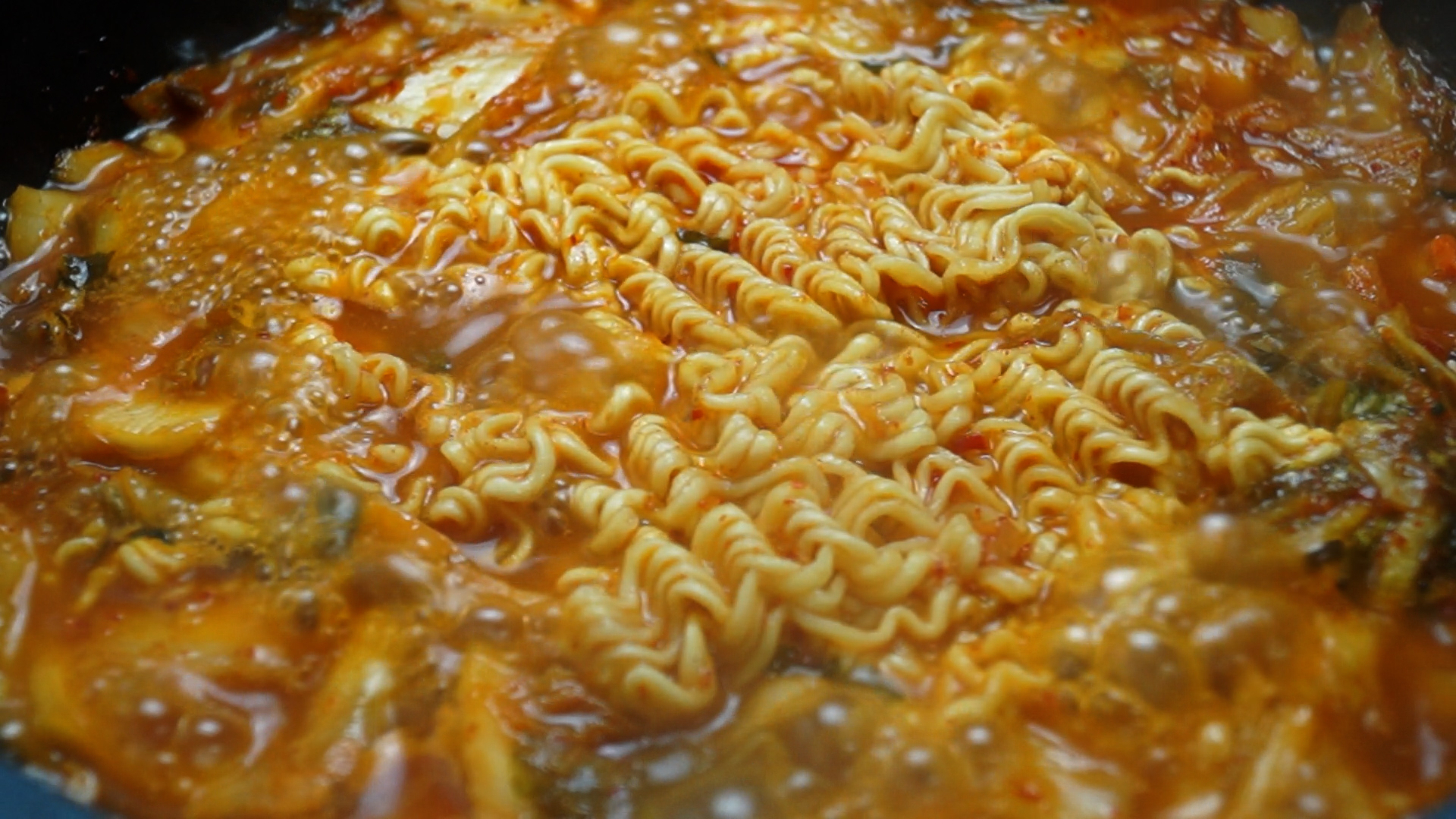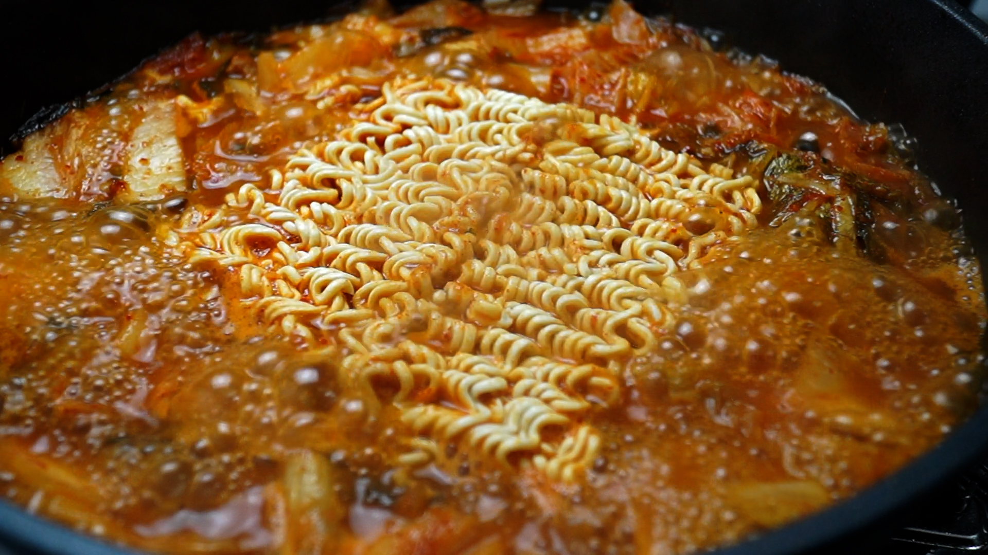 22. 4~5분 끓인 국물에 라면을 넣고 4분 정도를 더 끓여 라면을 익혀주세요.