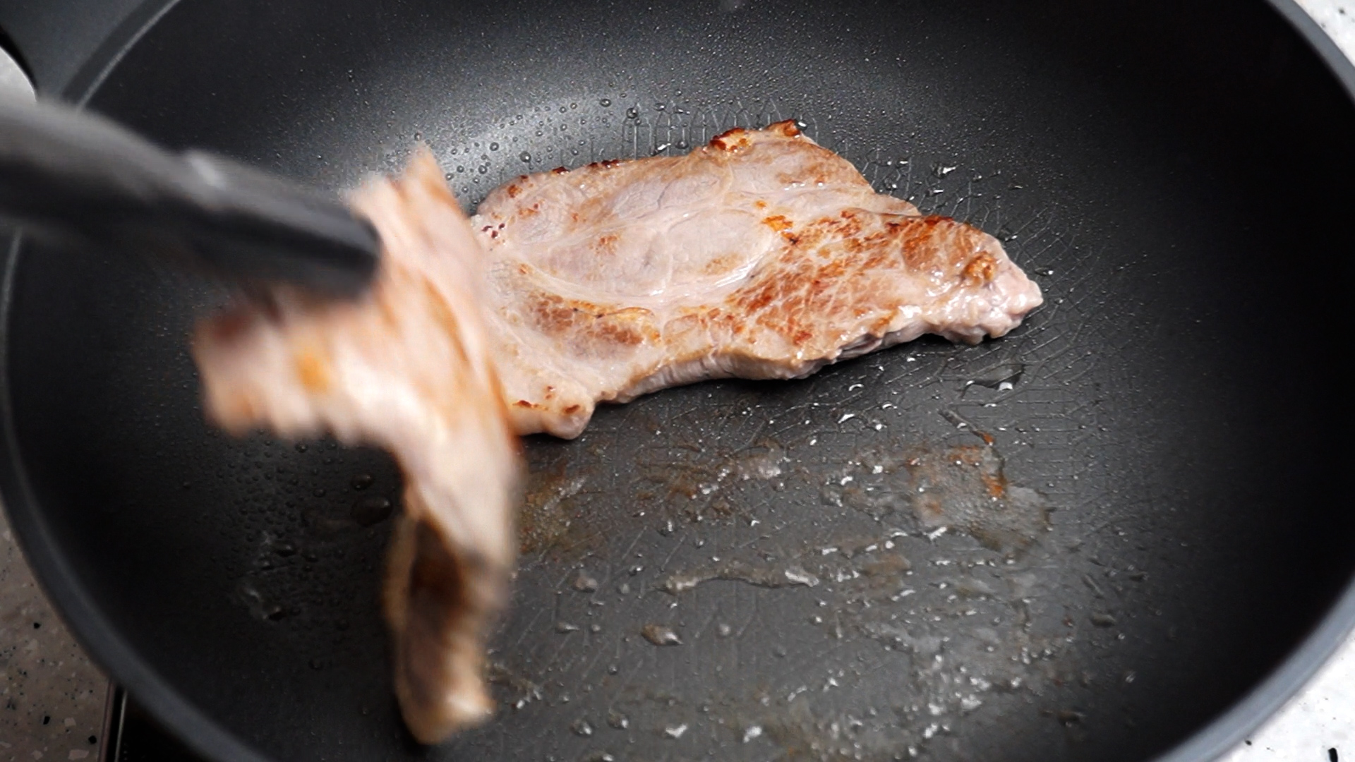 14. 삼겹살 또는 돼지목살을 강불로 달군팬에 올려 사진 처럼 돼지기름이 자글자글 나오게 구워주세요.