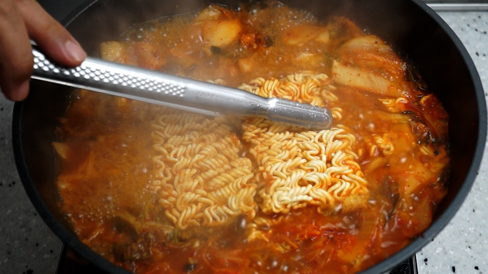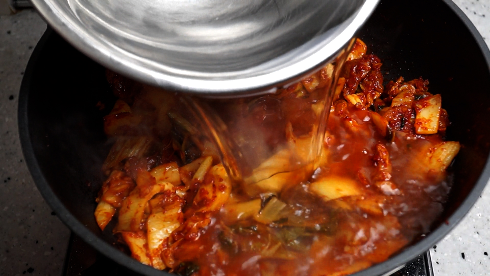 19. 김치가 맛있게 볶아 졌으면 물을 부어주세요.