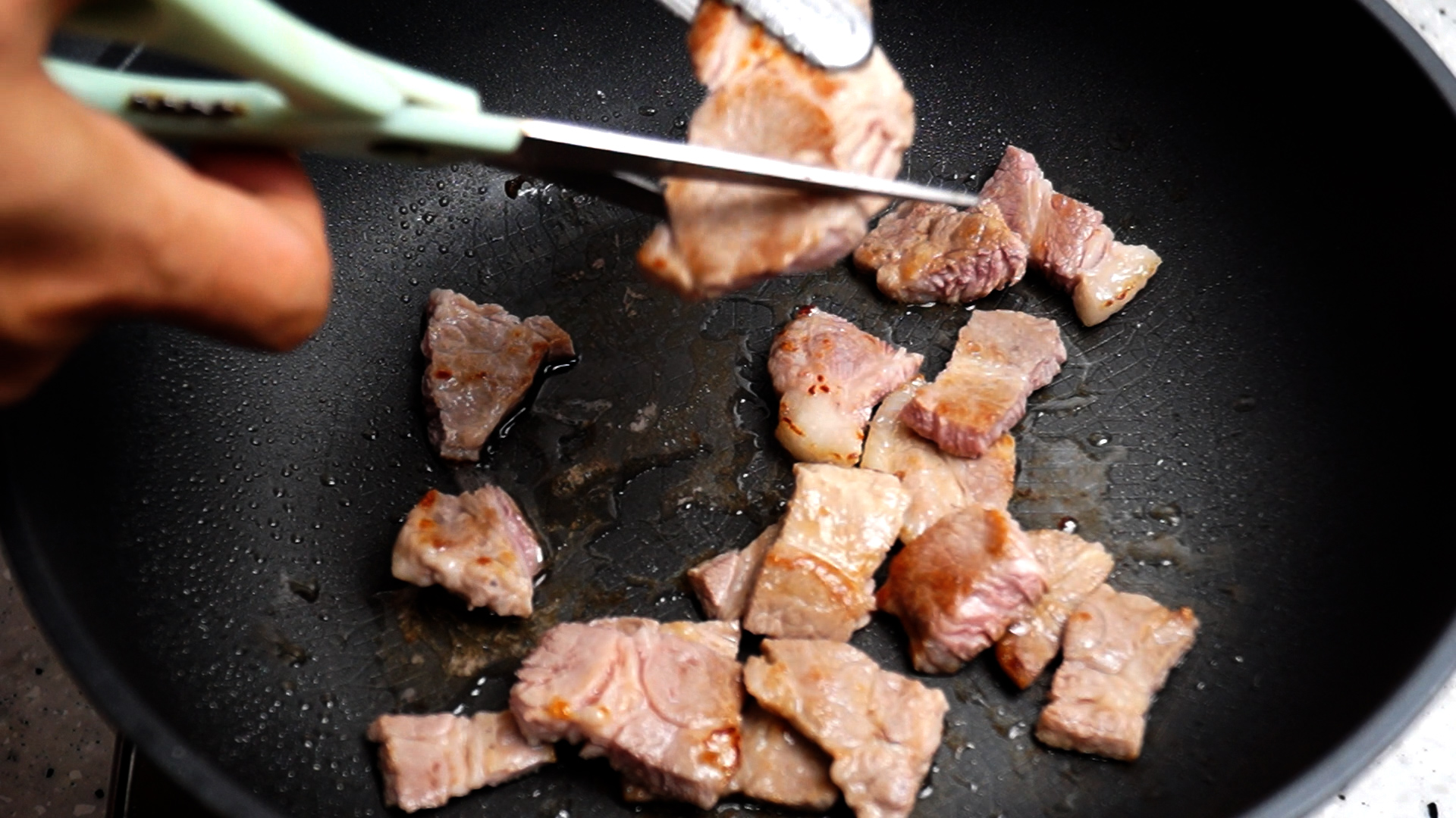 15. 고기는 적당한 크기로 잘라주세요. 자르는동안 고기가 탈것 같으면 불을 잠시 꺼놓고 자르세요.