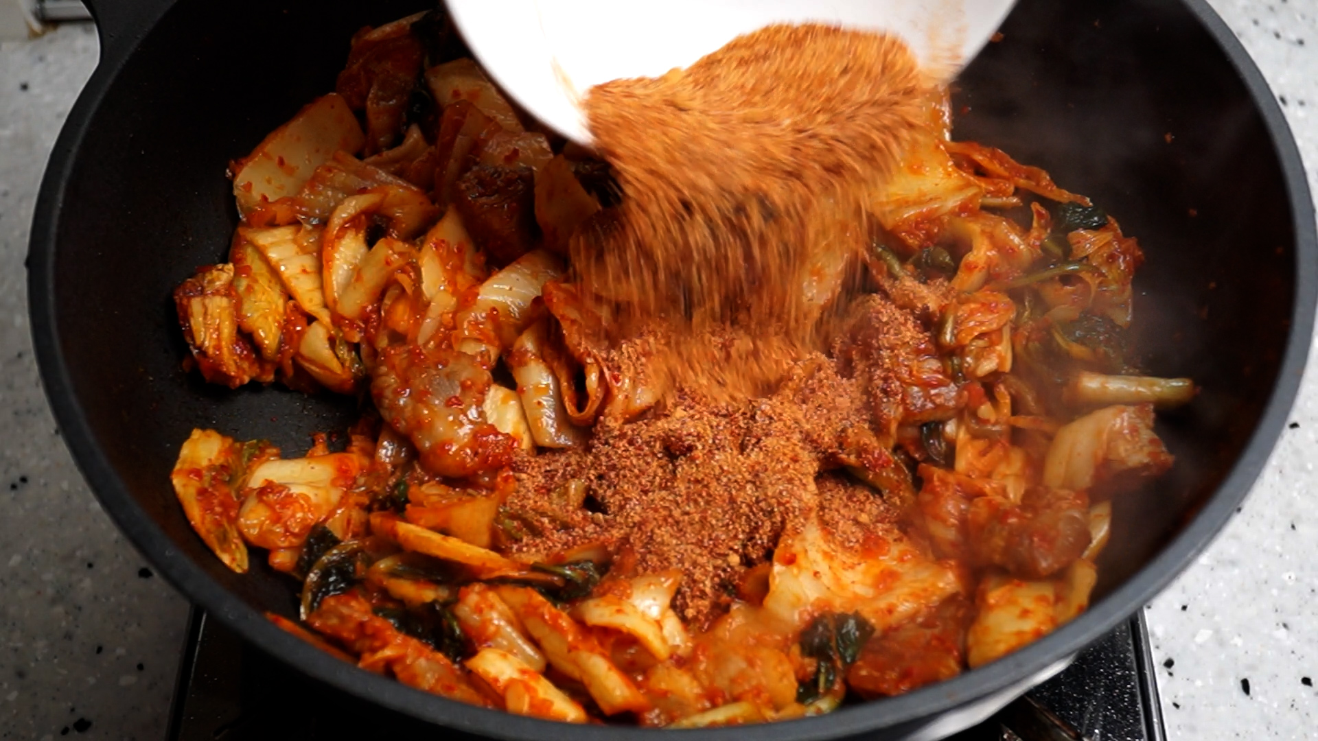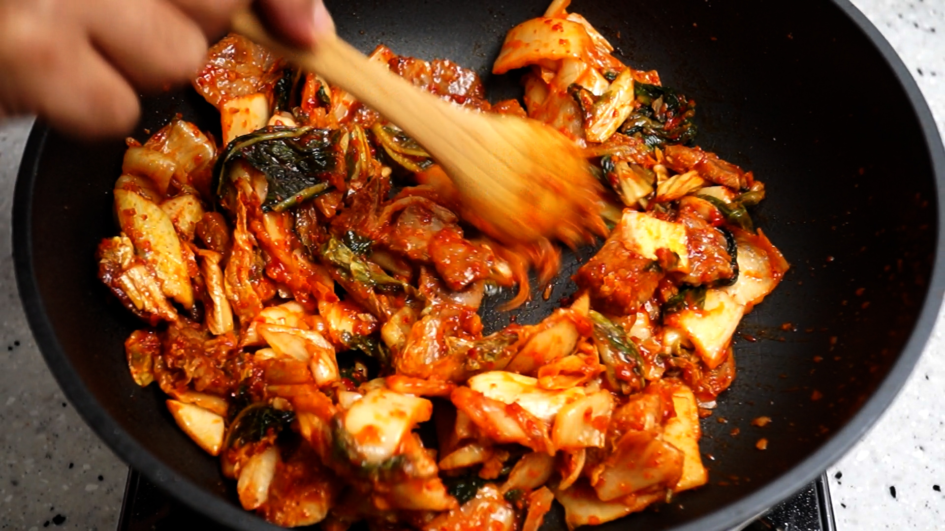 17. 섞어 놓은 김치를 넣고 강불 유지하고 2분을 볶아주세요.