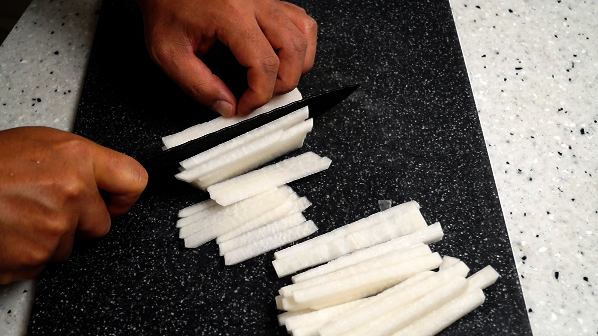 1. 쓴맛없는 가을무우로 200g 준비해서 0.5cm 이하로 채를 썰어주세요.