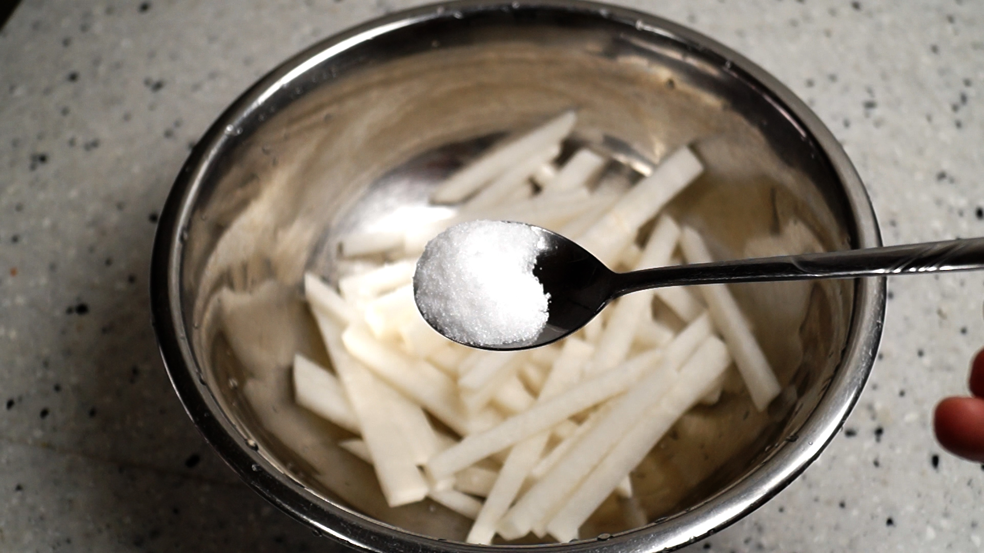 2. 무우를 볼에 담고 절임 재료를 넣고 중간중간 섞어가며 30~40분을 절이세요