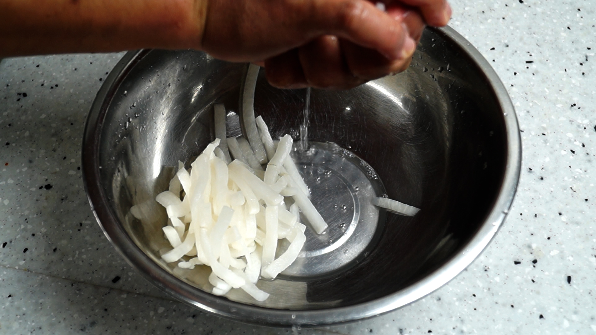 4. 절인 무우를 찬물을 부어 가볍게 씻어주세요.