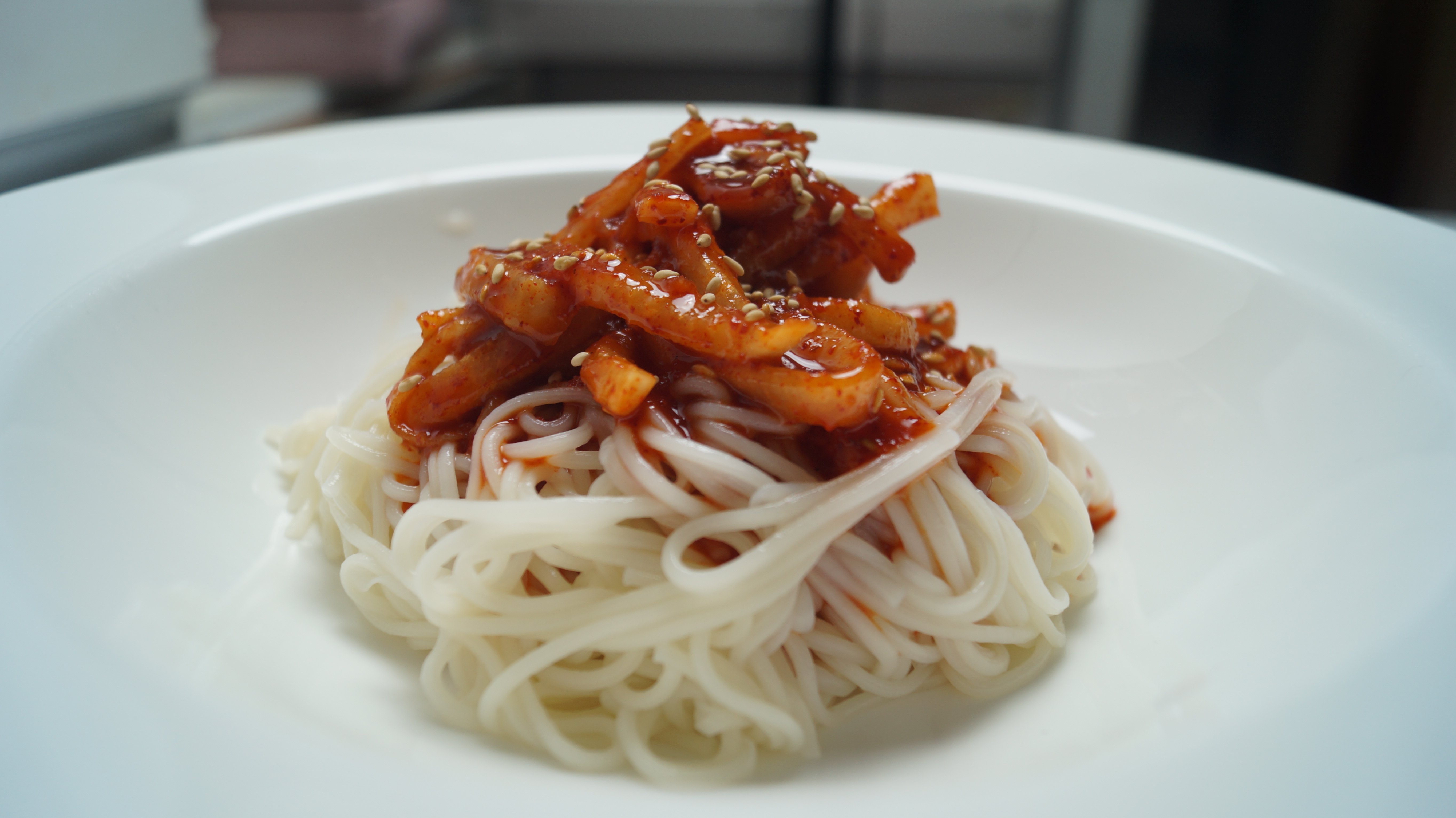 8. 국수 삶아서 양념된 무우를 적당히 올려주세요.