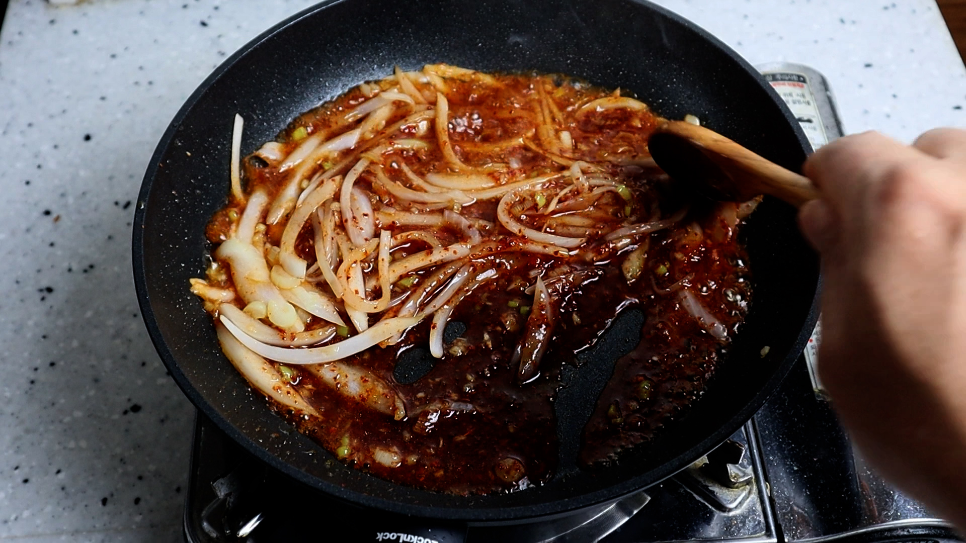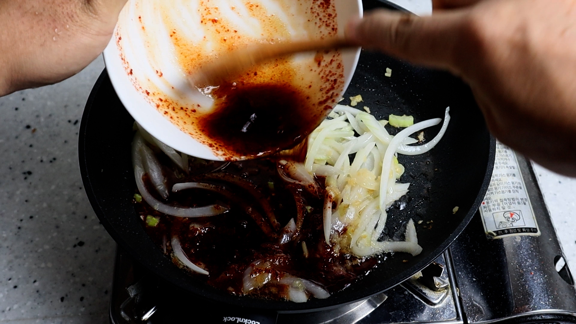 14. 양파가 살짝 투명해지면 양념장을 부어주세요. 어묵을 먼저 볶는게 아니라 양념을 기름에 살짝 튀겨주면 어묵볶음이 더욱 맛있습니다.