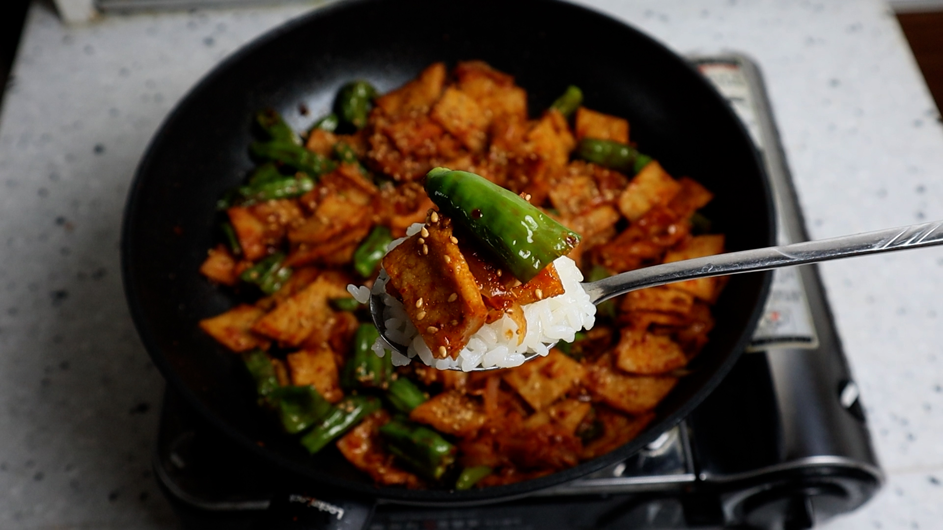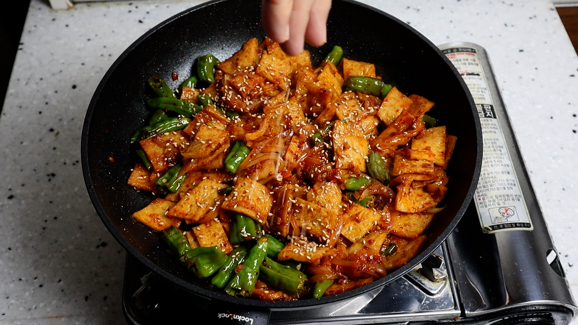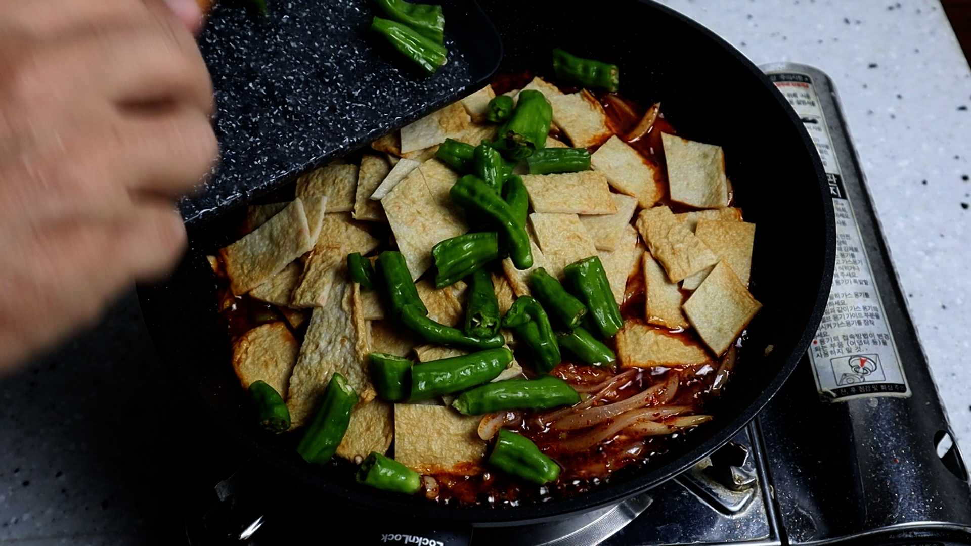 16. 어묵과 꽈리고추를 동시에 넣어주세요.
