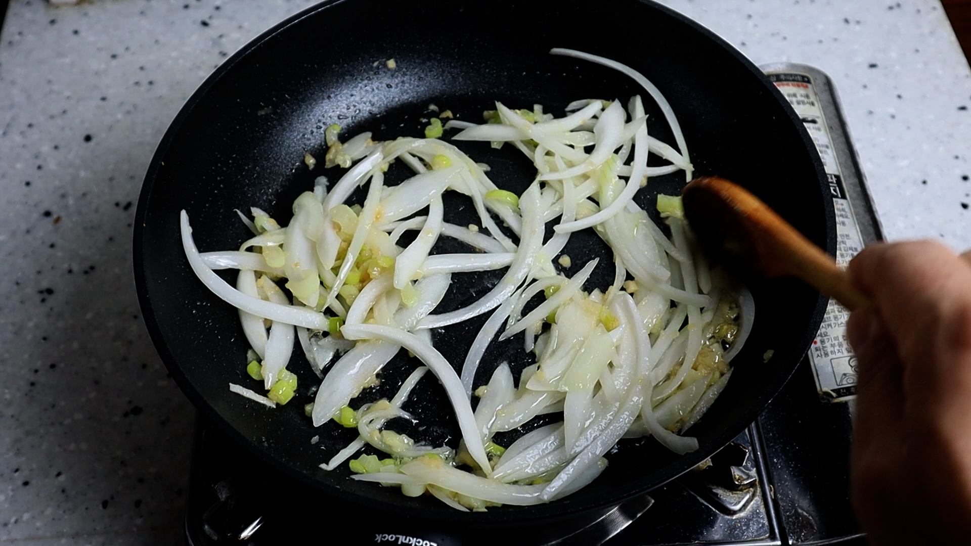 13. 양파를 넣으시고 불을 강불로 올린 다음 1분간 강하게 볶아주세요.