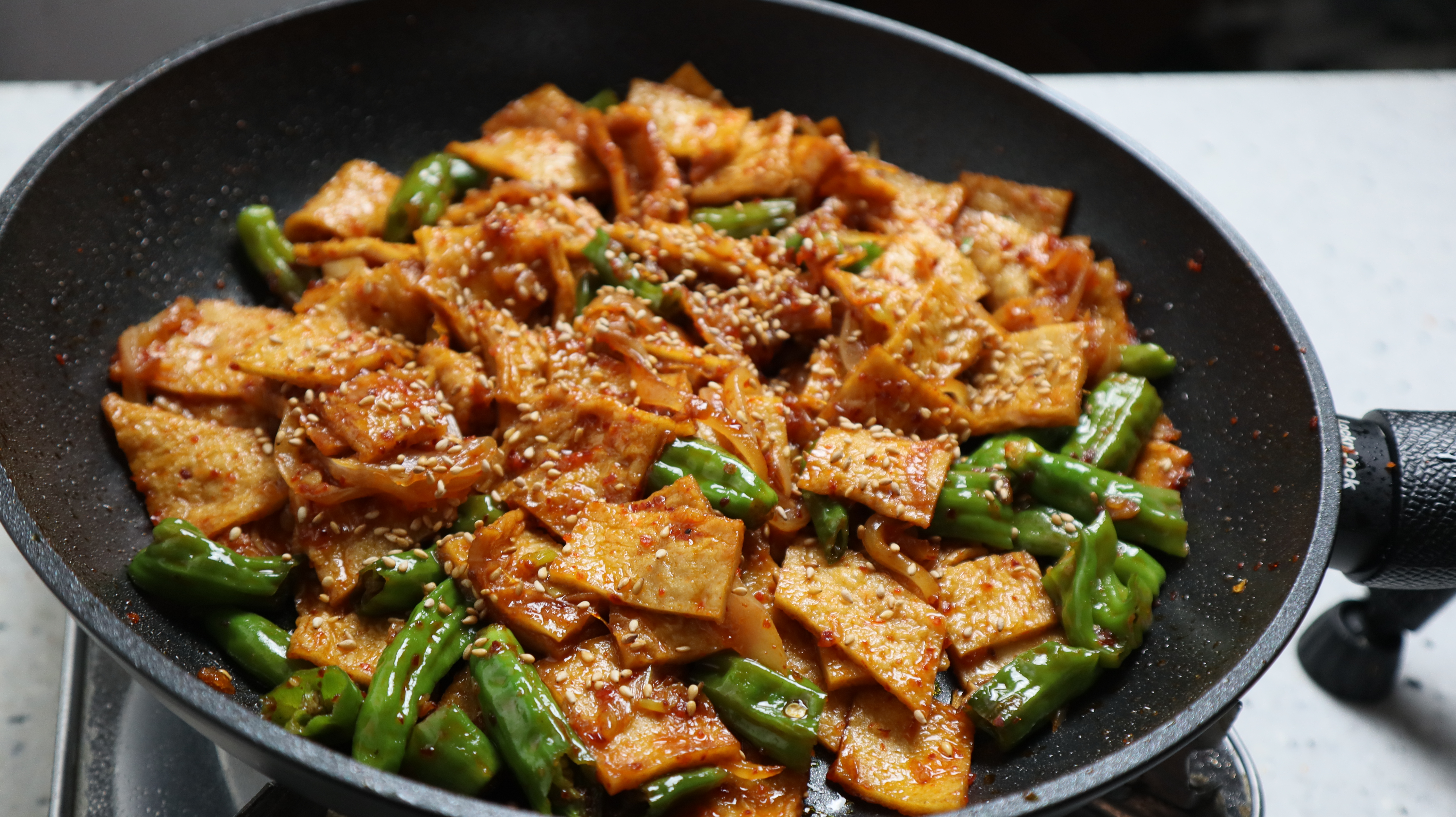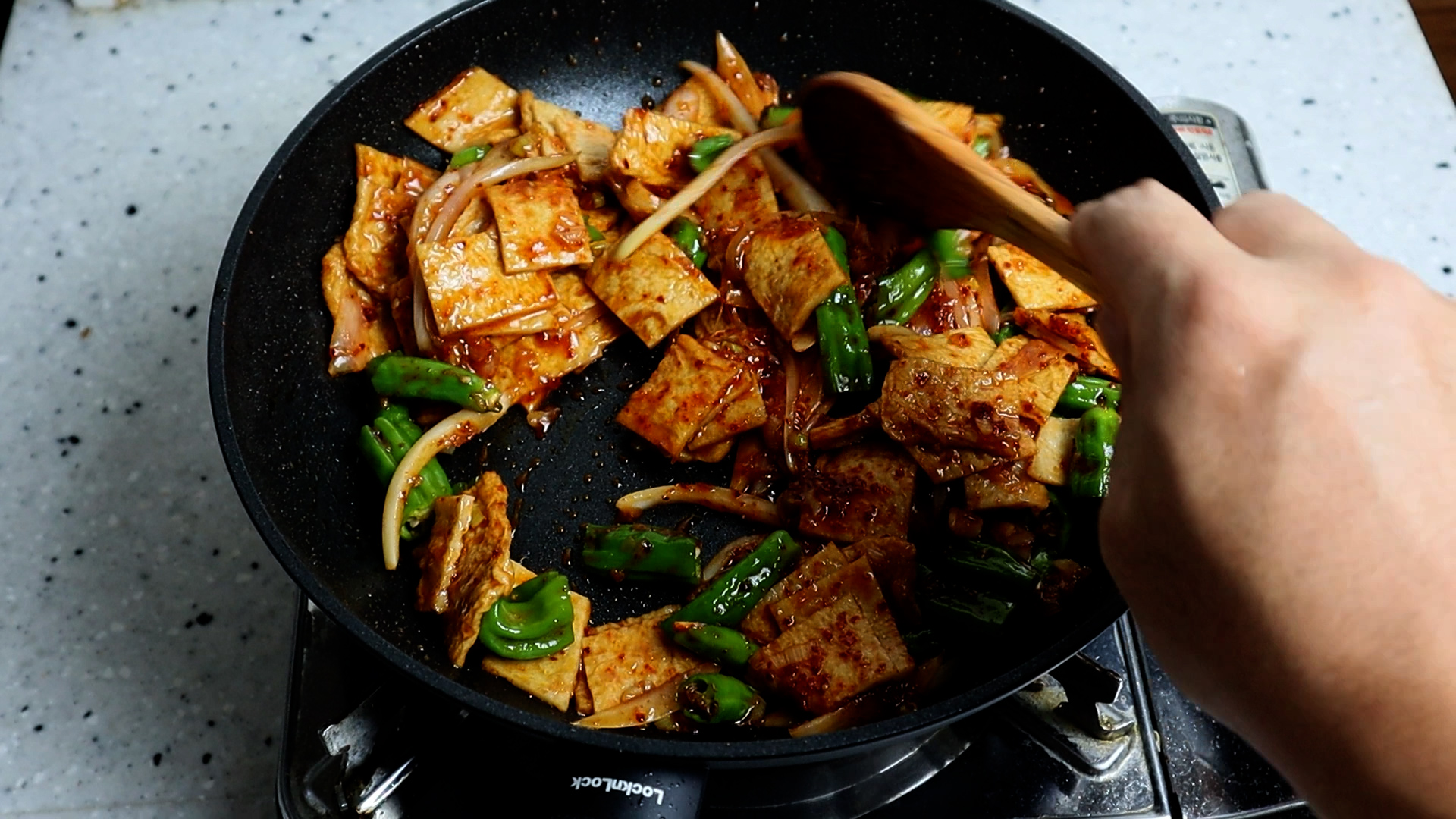 17. 골고루 섞으며서 1분 정도를 볶아주세요. 너무 오래 볶으면 꽈리고추가 숨이 확 죽어버리고 질겨질수 있습니다.