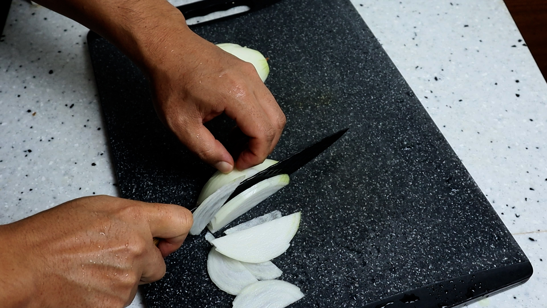 1. 양파는 조금 얇게 채 썰어주세요. 양파는 어묵과 같이 먹는 용도라기 보단 이번엔 단맛과 수분을 내기 위한 용도라 좀 얇게 썰어주는게 좋아요.