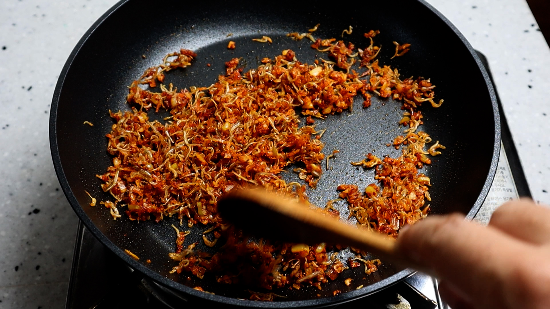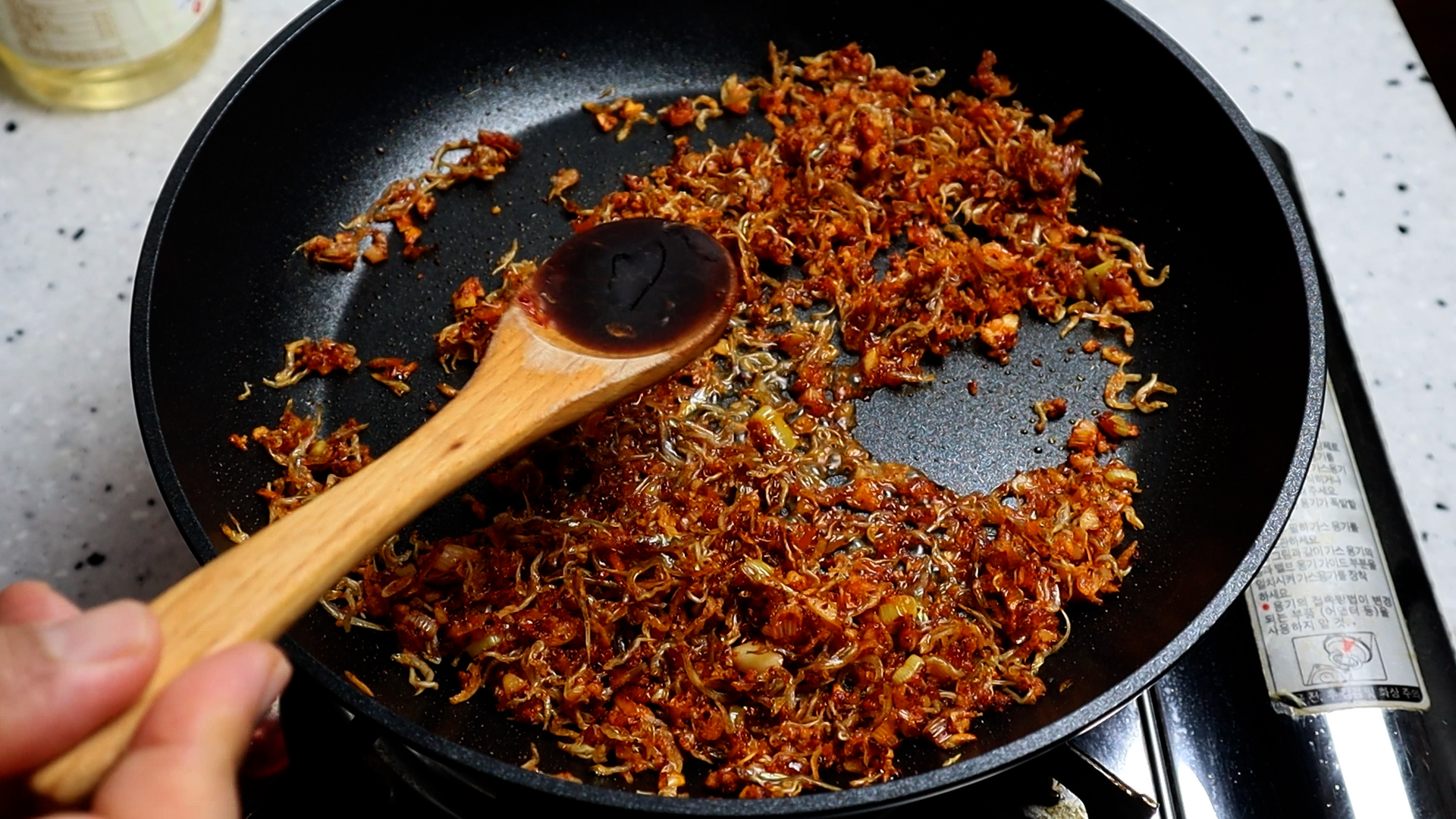 8. 잔멸치를 넣고는 약불 유지하고 1분 30초를 볶아주세요.