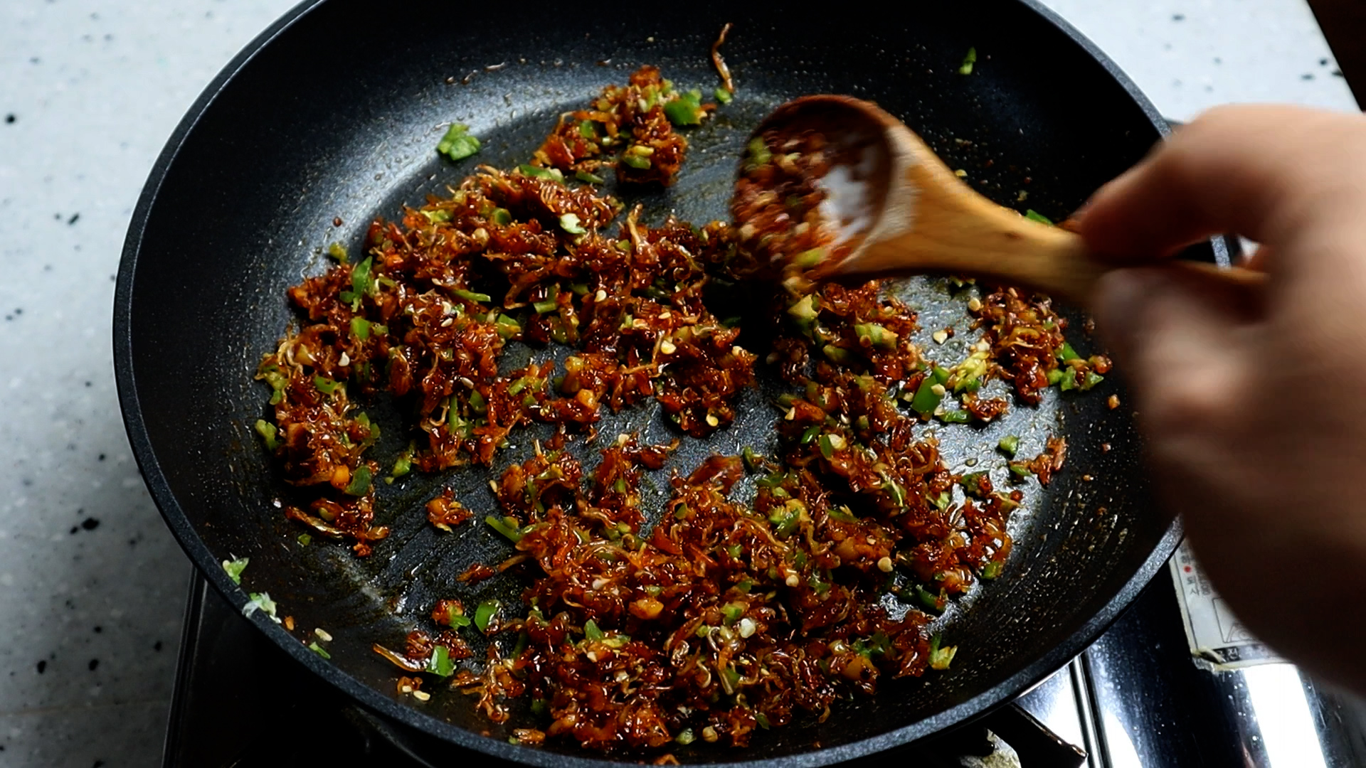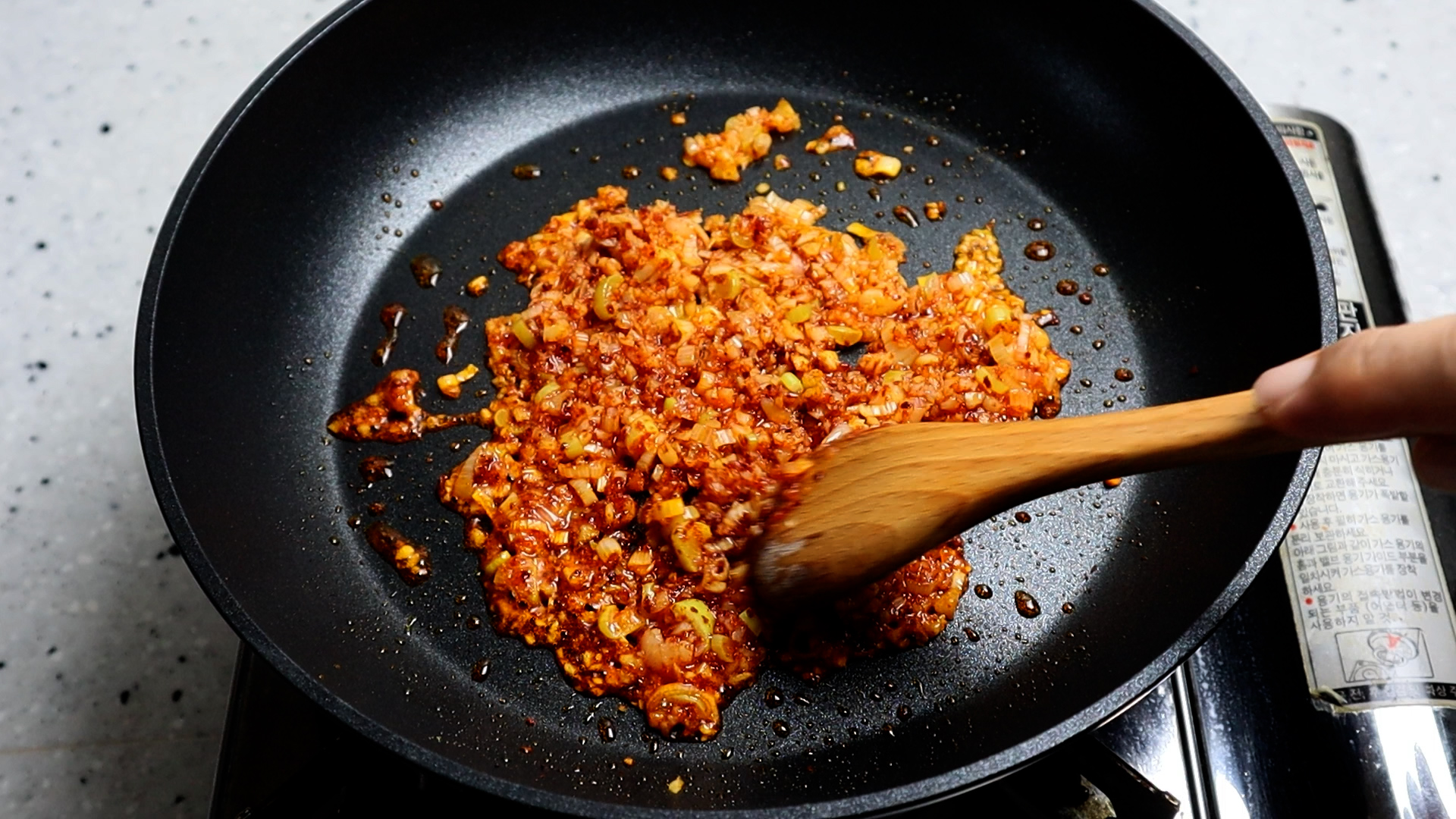 6. 약불에 재료가 자글거리기 시작한 후 부터 2~3분 정도를 볶아 재료의 향을 기름에 확 살려주세요.