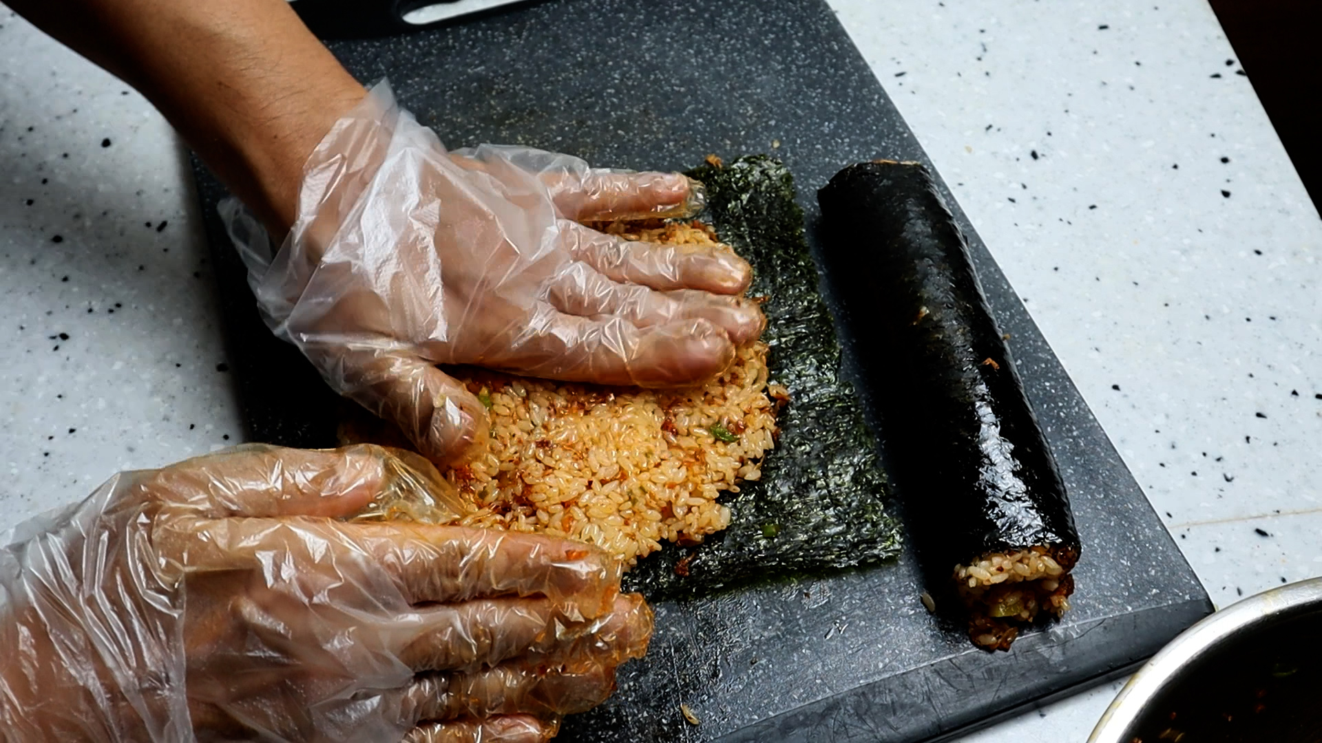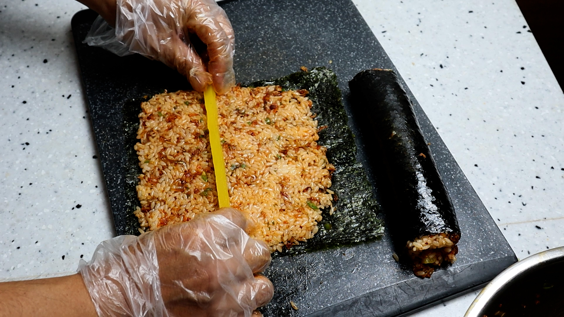 19. 김에 밥을 올려 꾹꾹꾹 눌러 주세요.