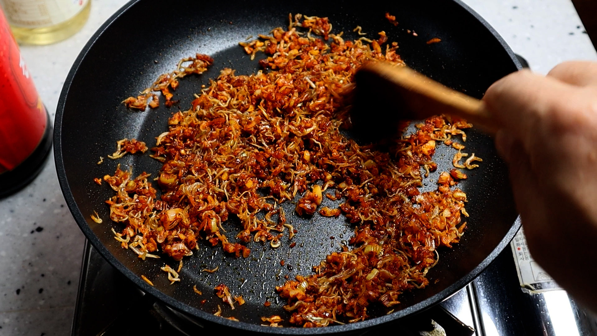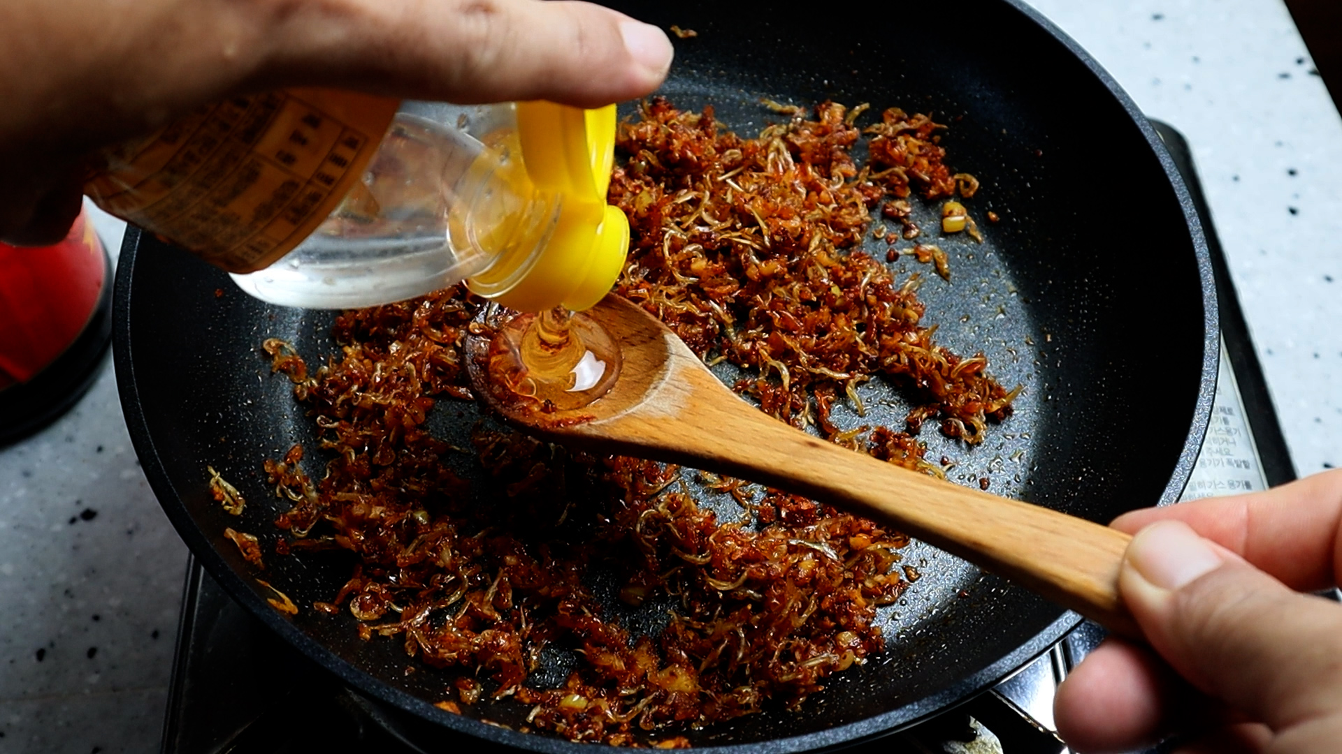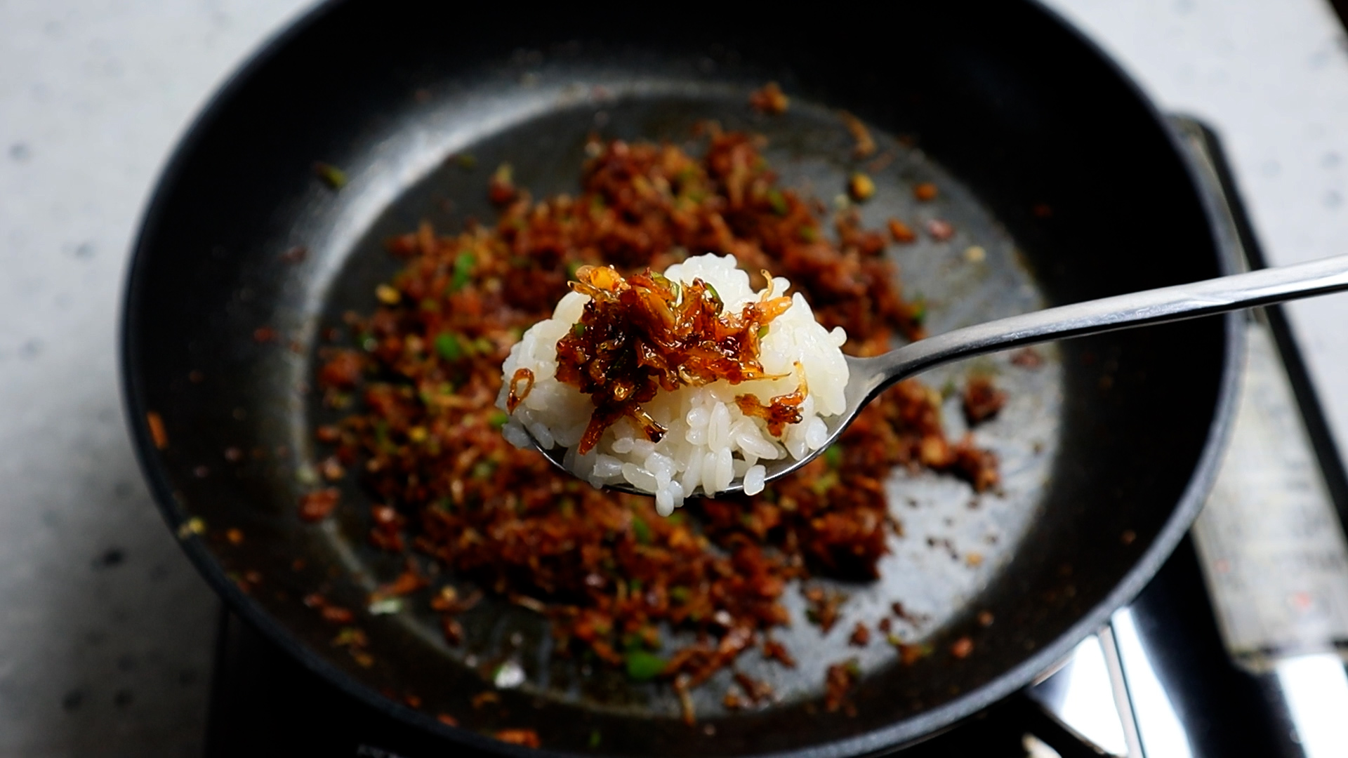 17. 밥 2공기에 멸치볶음을 70~80% 정도 부어주세요. 간을 좀 쎄게 드시면 전부 넣으셔도 됩니다.